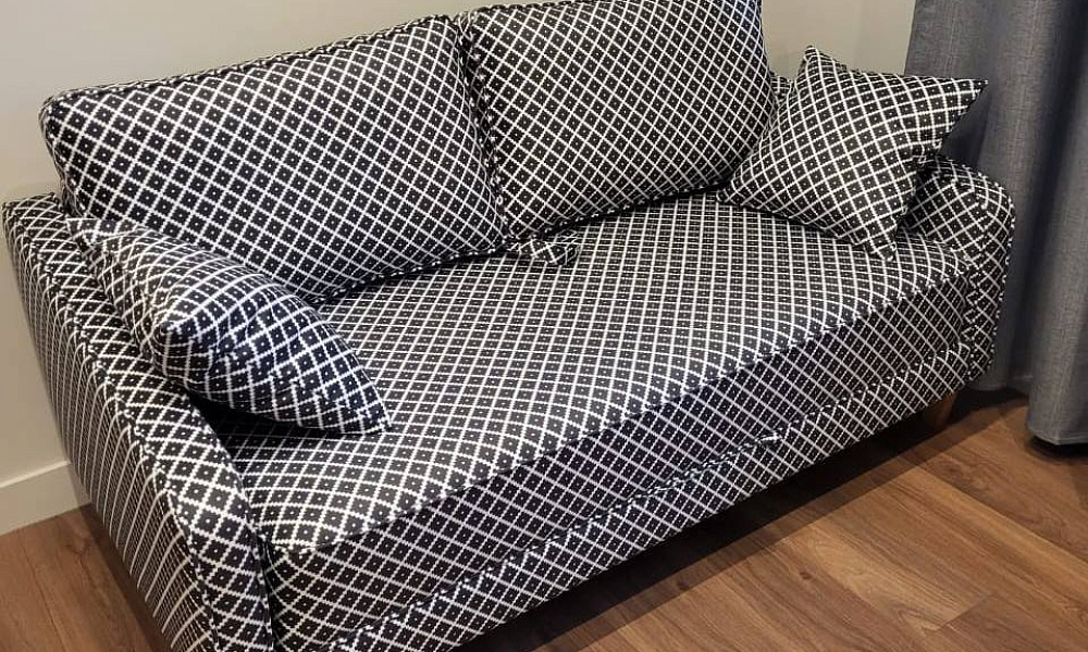 Диванчик аккуратненький, немного жестковат, на мой взгляд. Ткань очень приятная, играет.