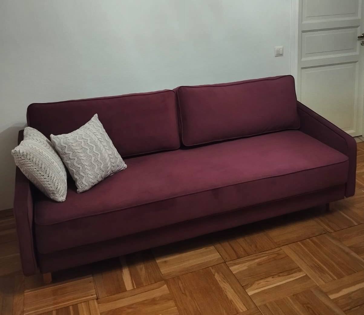 Сам диван то, что мне было нужно: средней жёсткости , с независимым пружинным блоком. Цвет, конечно, красивый, акцентный. Комната только что после ремонта, все хочется поменять. Подберу новую тюль, нарисую несколько интерьерных картин, тогда будет гармонично.