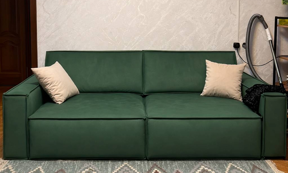 Диван уже какое то время в эксплуатации, никаких замечаний нет. К интерьеру прекрасно подошёл. Очень удобный, ткань безумно приятная. И не только для меня — кот целыми днями по дивану скачет, но не подрал :)