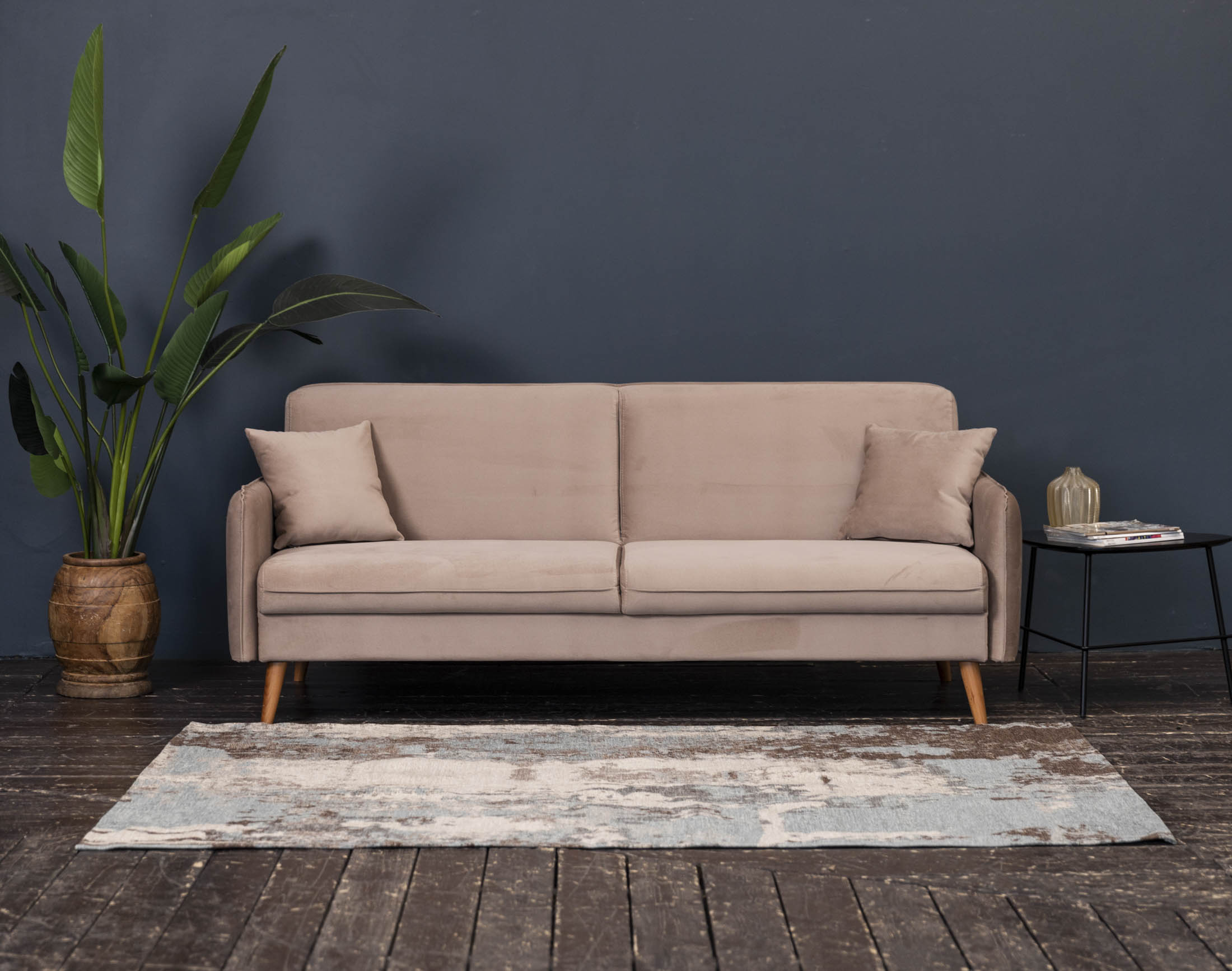 Высокие ножки дивана делают его форму легкой, максимально открывая пространство. А натуральное дерево подчеркивает естественность материалов. Кроме того, такая конструкция упрощает уборку, делая доступным напольное покрытие.