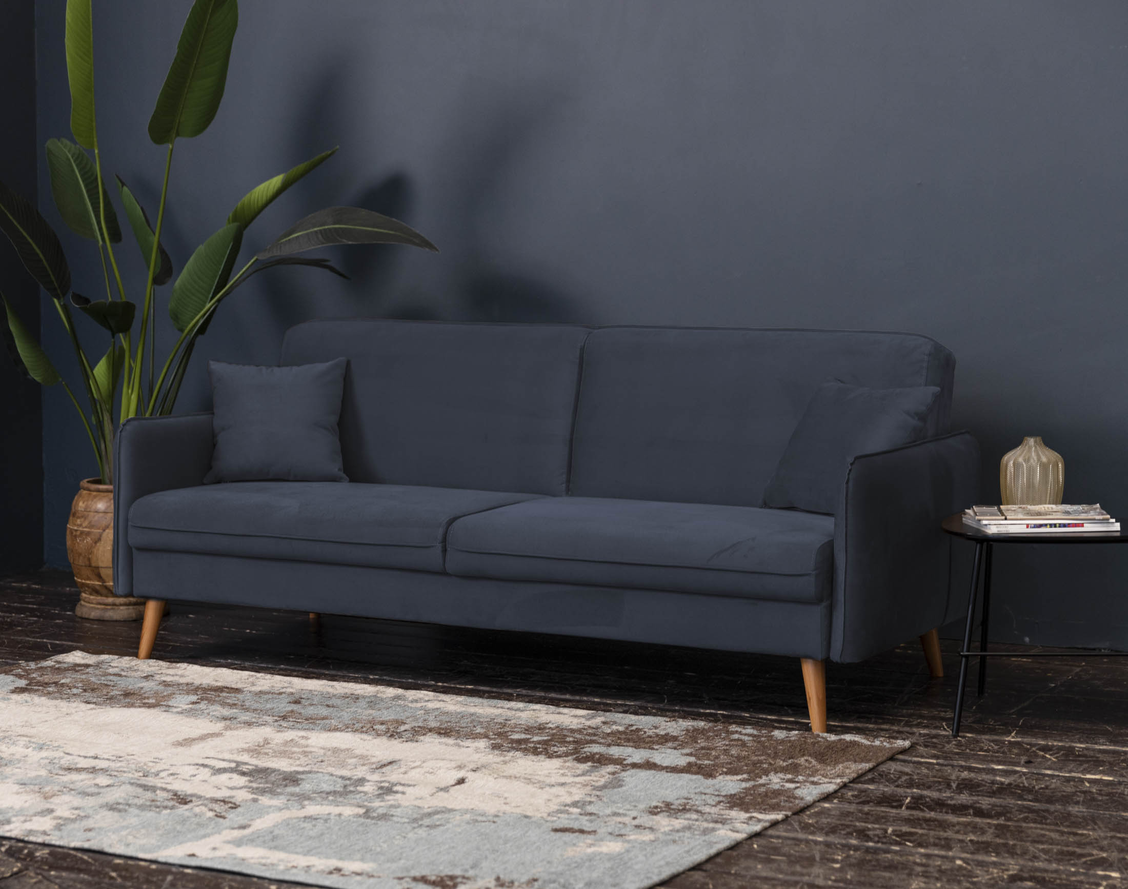 Высокие ножки дивана делают его форму легкой, максимально открывая пространство. А натуральное дерево подчеркивает естественность материалов. Кроме того, такая конструкция упрощает уборку, делая доступным напольное покрытие.