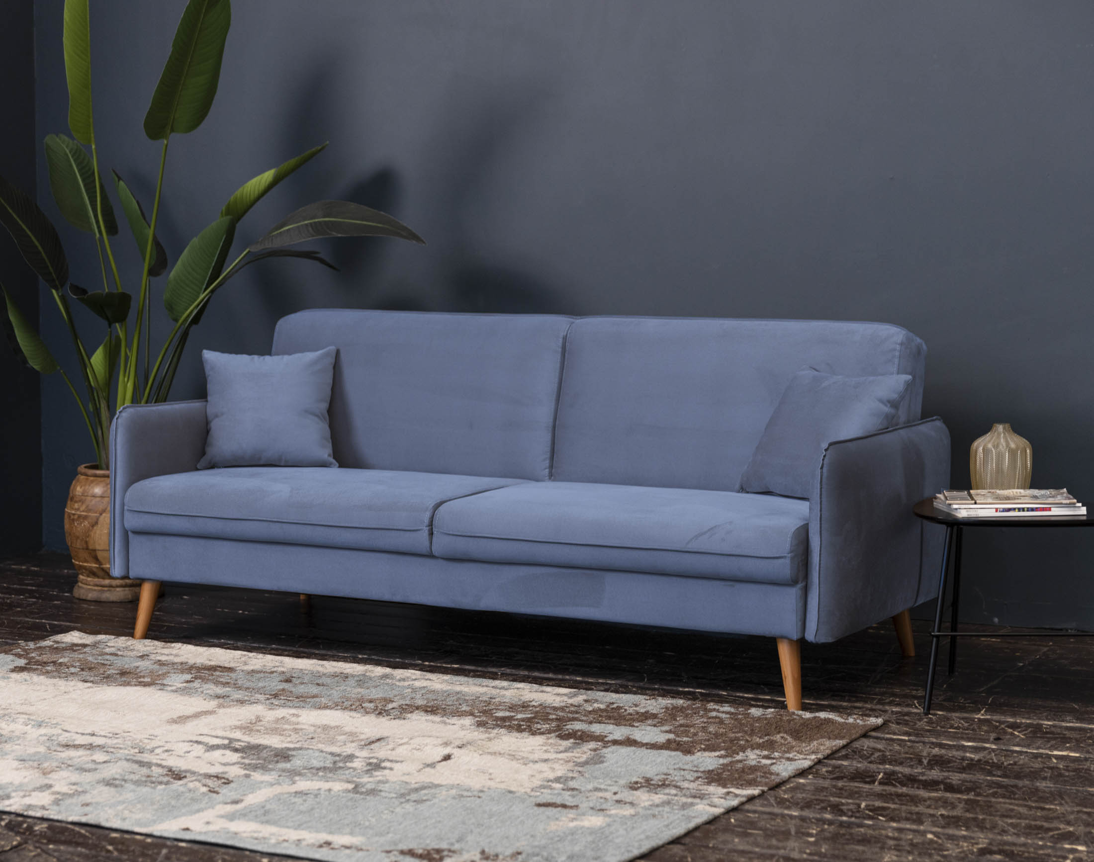 Высокие ножки дивана делают его форму легкой, максимально открывая пространство. А натуральное дерево подчеркивает естественность материалов. Кроме того, такая конструкция упрощает уборку, делая доступным напольное покрытие.