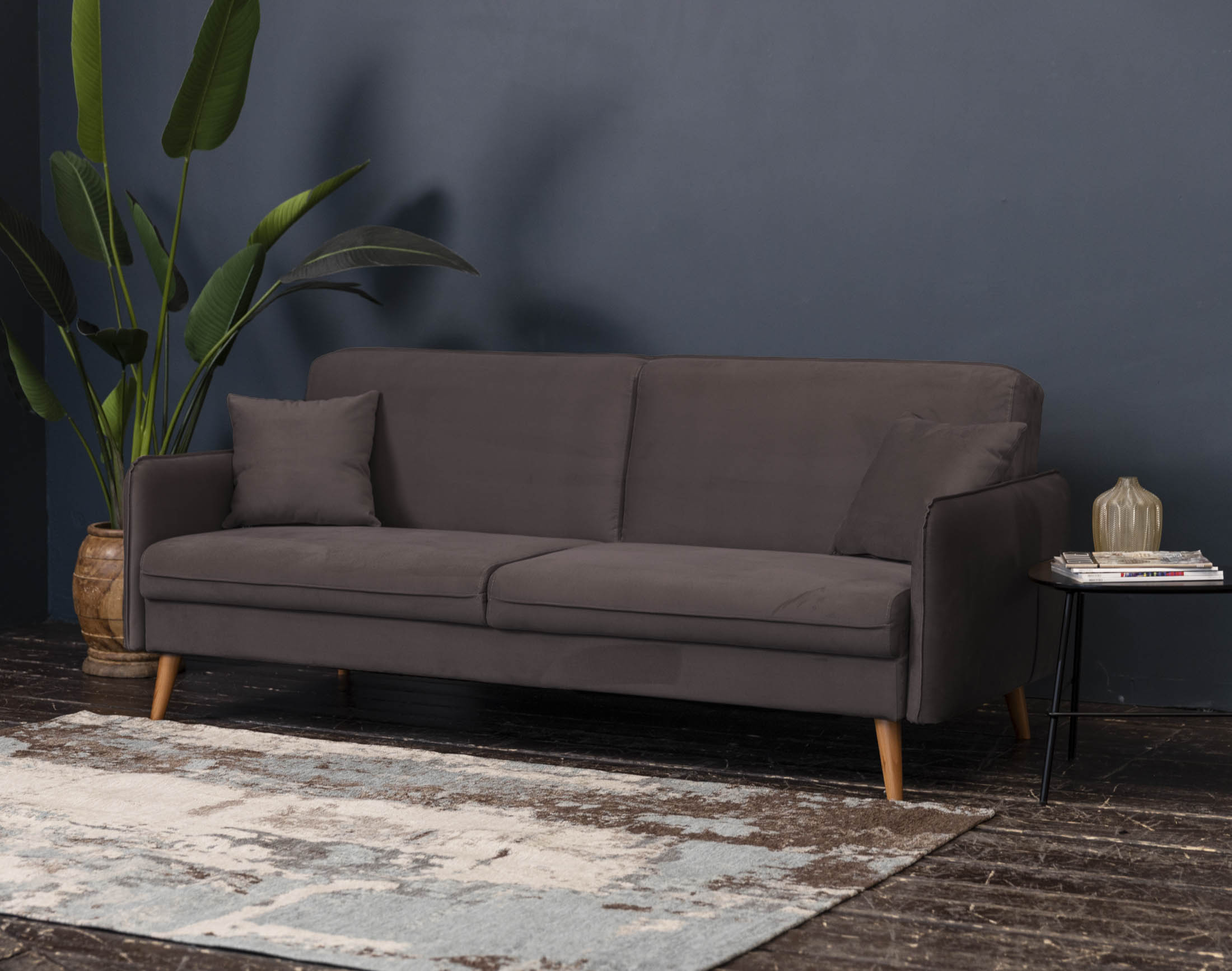 Высокие ножки дивана делают его форму легкой, максимально открывая пространство. А натуральное дерево подчеркивает естественность материалов. Кроме того, такая конструкция упрощает уборку, делая доступным напольное покрытие.