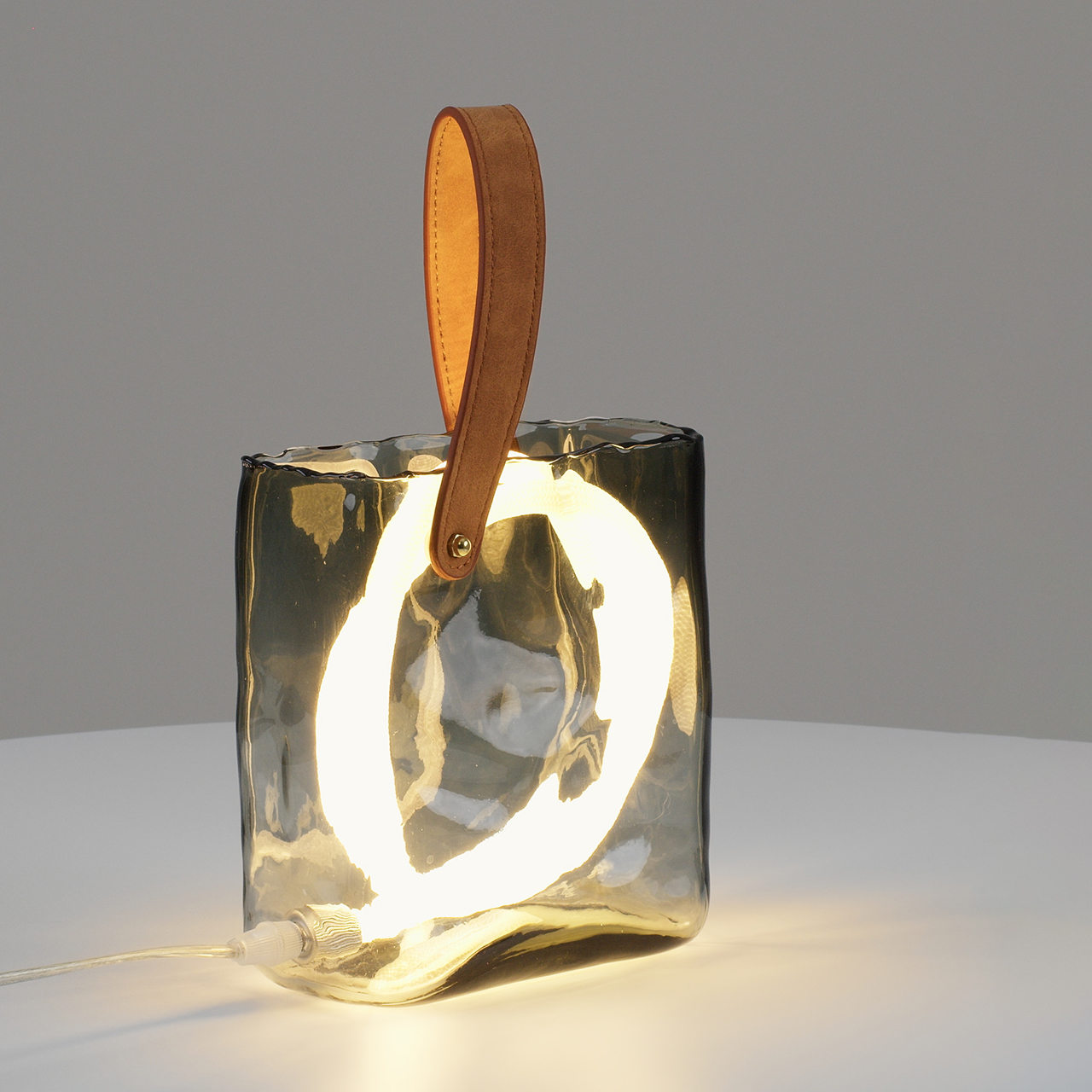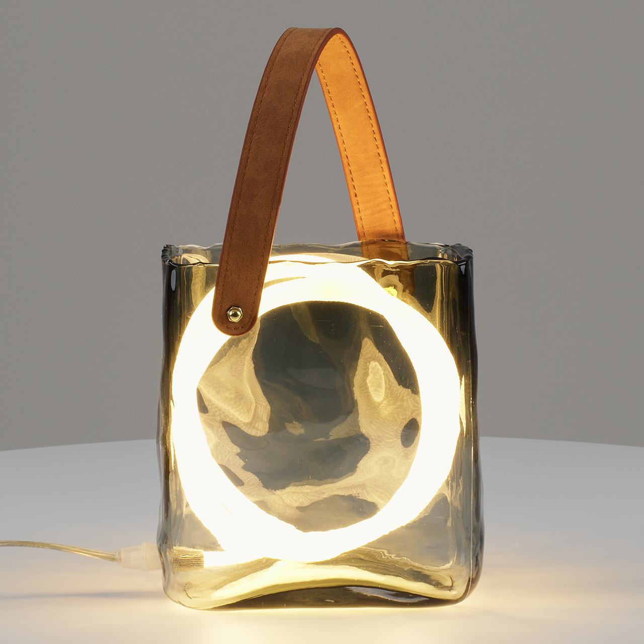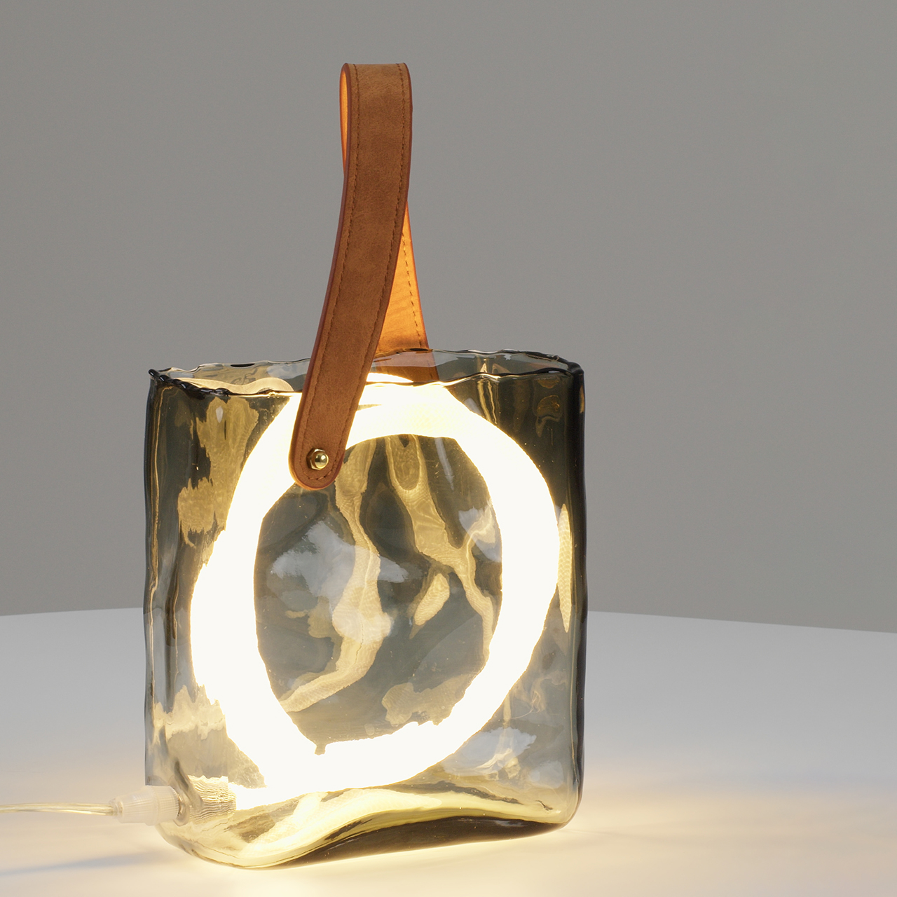 Настольная лампа Bag сразу привлекает внимание необычной формой — она выполнена в виде дизайнерской сумки с глянцевым стеклянным корпусом и ручкой. Сквозь прозрачные волны стекла просвечивает гибкая неоновая лента, создающая мягкое, тёплое свечение и эффект живого света. Лампа выглядит словно арт-инсталляция, объединяя эстетику и практичность.