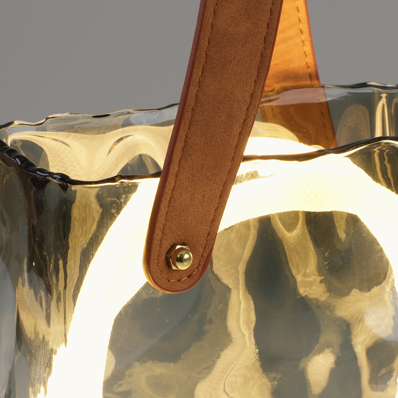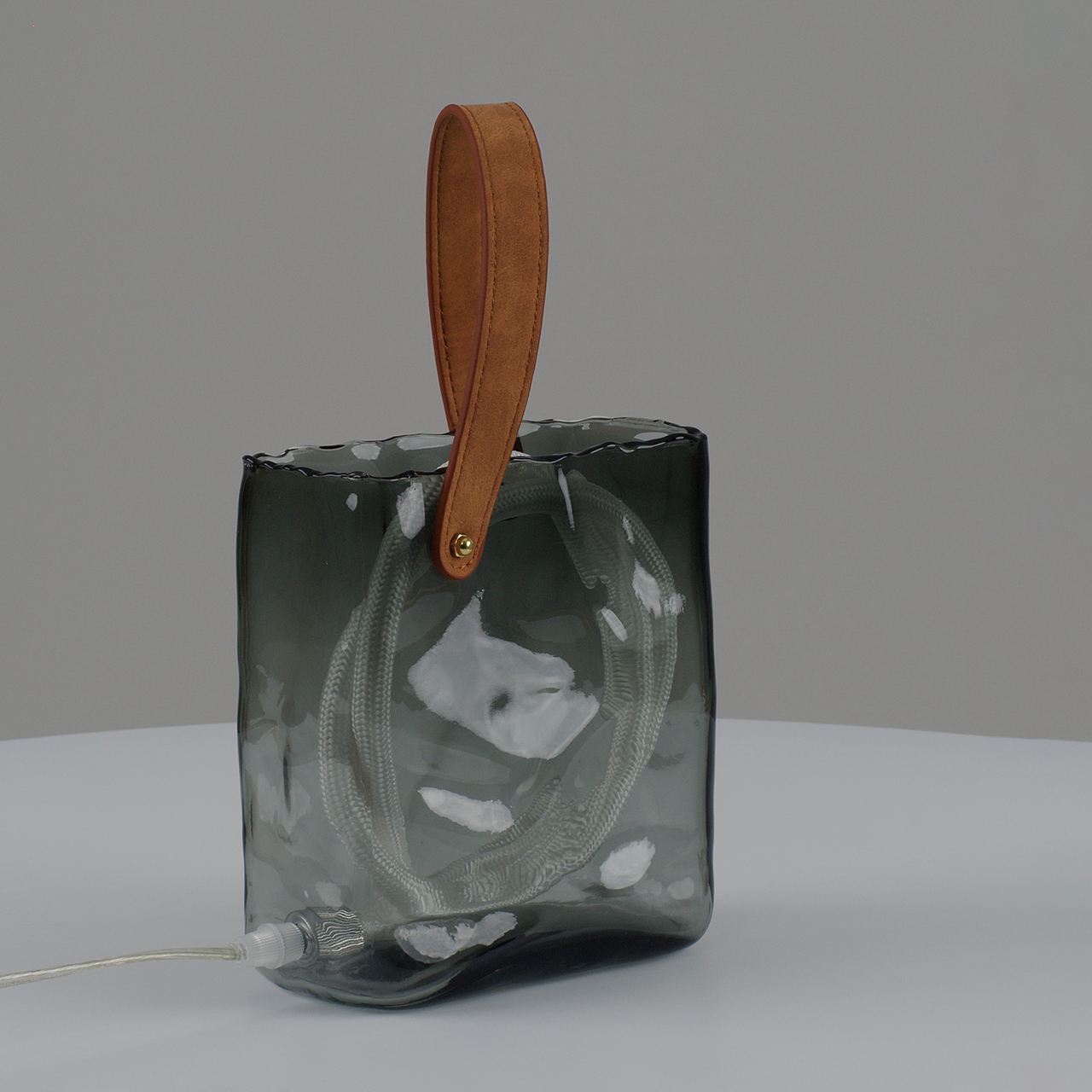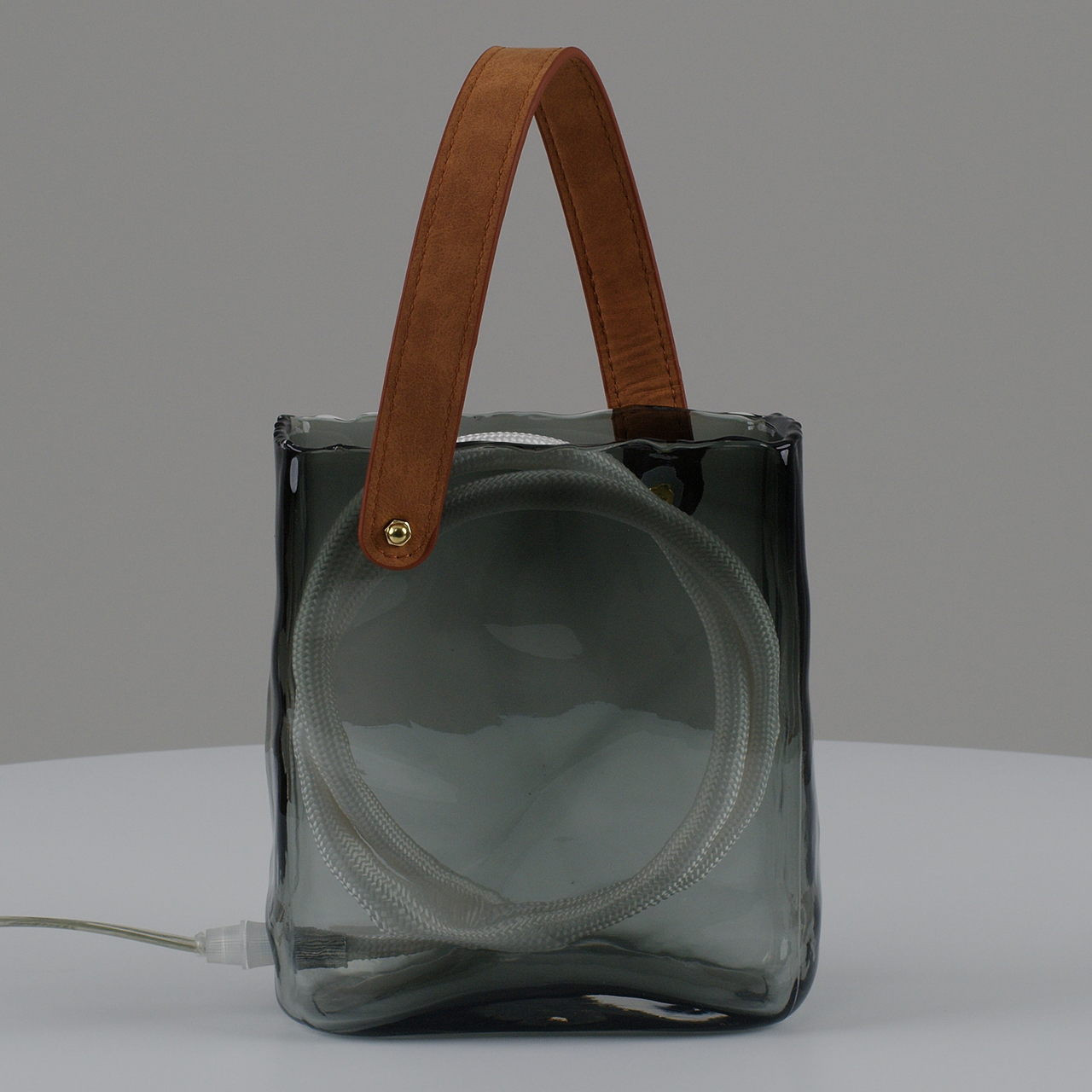 Настольная лампа Bag сразу привлекает внимание необычной формой — она выполнена в виде дизайнерской сумки с глянцевым стеклянным корпусом и ручкой. Сквозь прозрачные волны стекла просвечивает гибкая неоновая лента, создающая мягкое, тёплое свечение и эффект живого света. Лампа выглядит словно арт-инсталляция, объединяя эстетику и практичность.