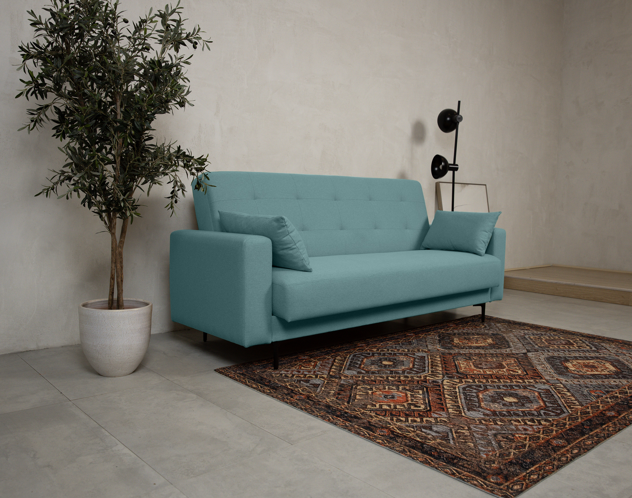 Высокие ножки дивана делают его форму легкой, максимально открывая пространство. Кроме того, такая конструкция упрощает уборку, делая доступным напольное покрытие.