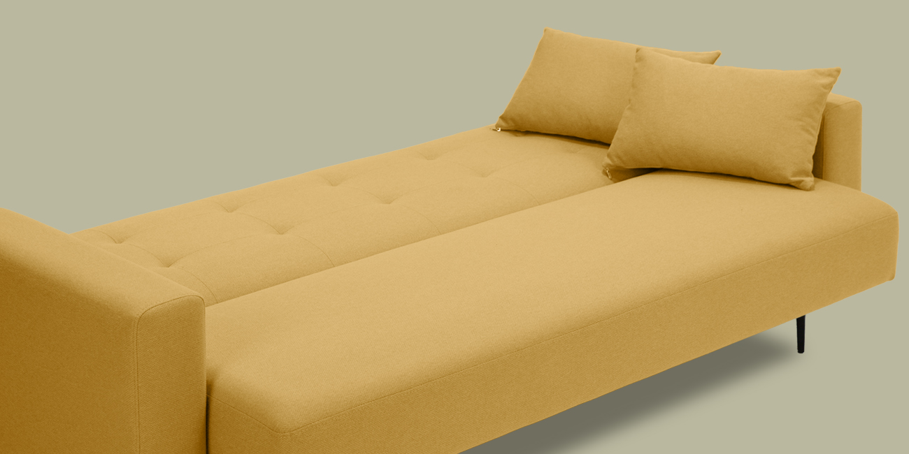 Высокие ножки дивана делают его форму легкой, максимально открывая пространство. Кроме того, такая конструкция упрощает уборку, делая доступным напольное покрытие.