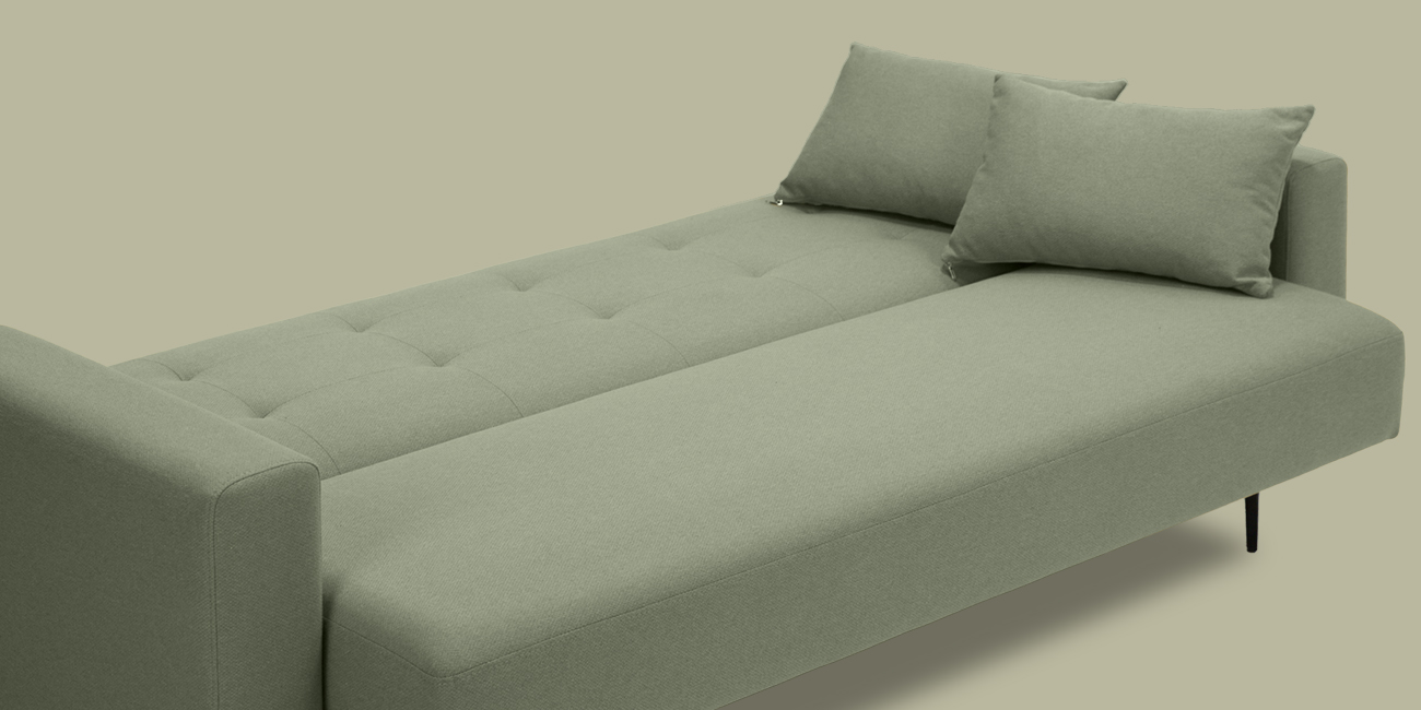 Высокие ножки дивана делают его форму легкой, максимально открывая пространство. Кроме того, такая конструкция упрощает уборку, делая доступным напольное покрытие.