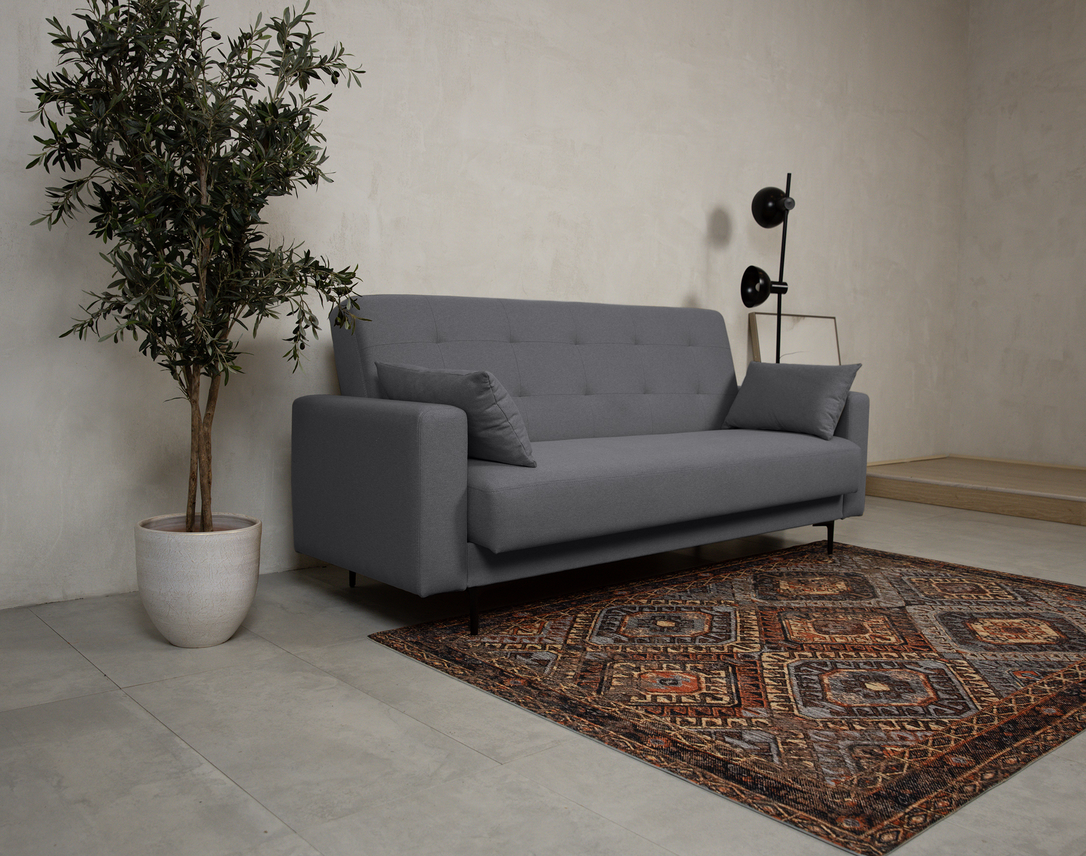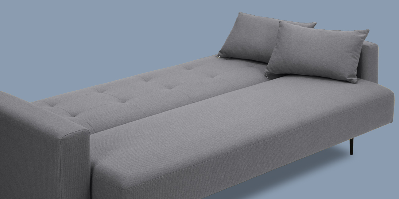 Высокие ножки дивана делают его форму легкой, максимально открывая пространство. Кроме того, такая конструкция упрощает уборку, делая доступным напольное покрытие.