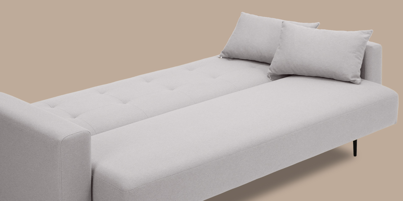 Высокие ножки дивана делают его форму легкой, максимально открывая пространство. Кроме того, такая конструкция упрощает уборку, делая доступным напольное покрытие.