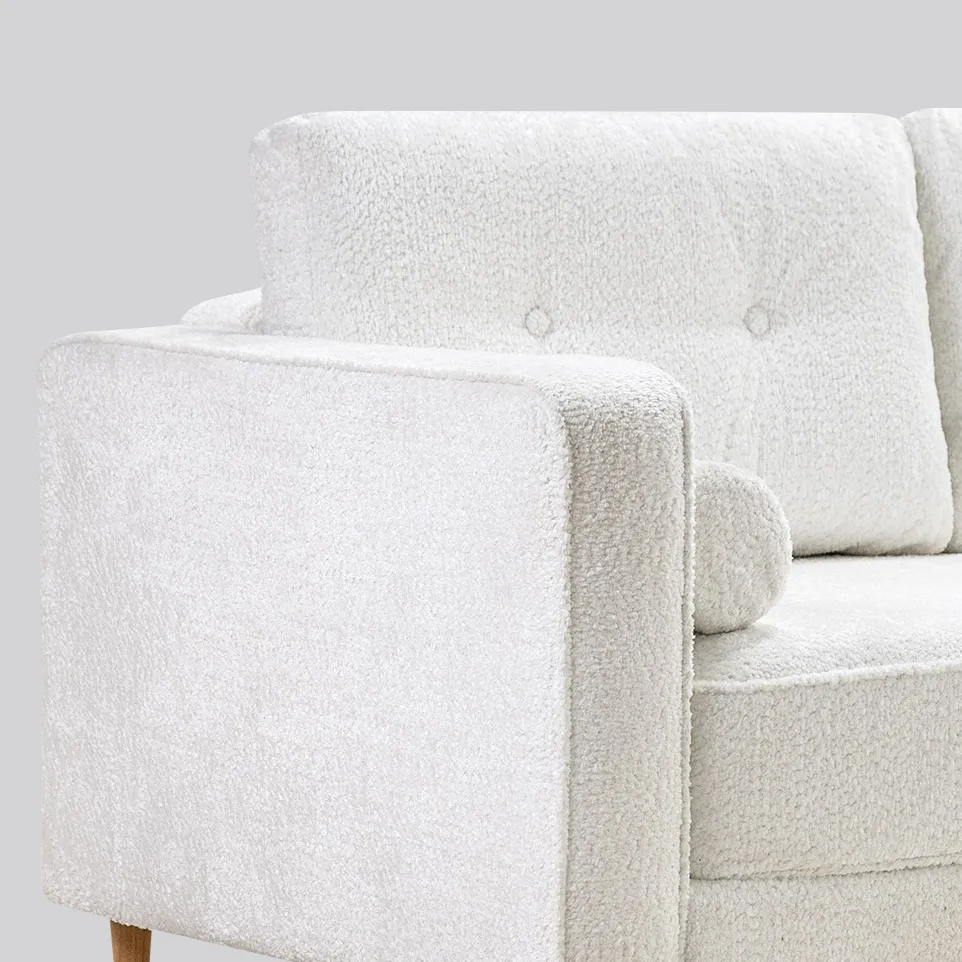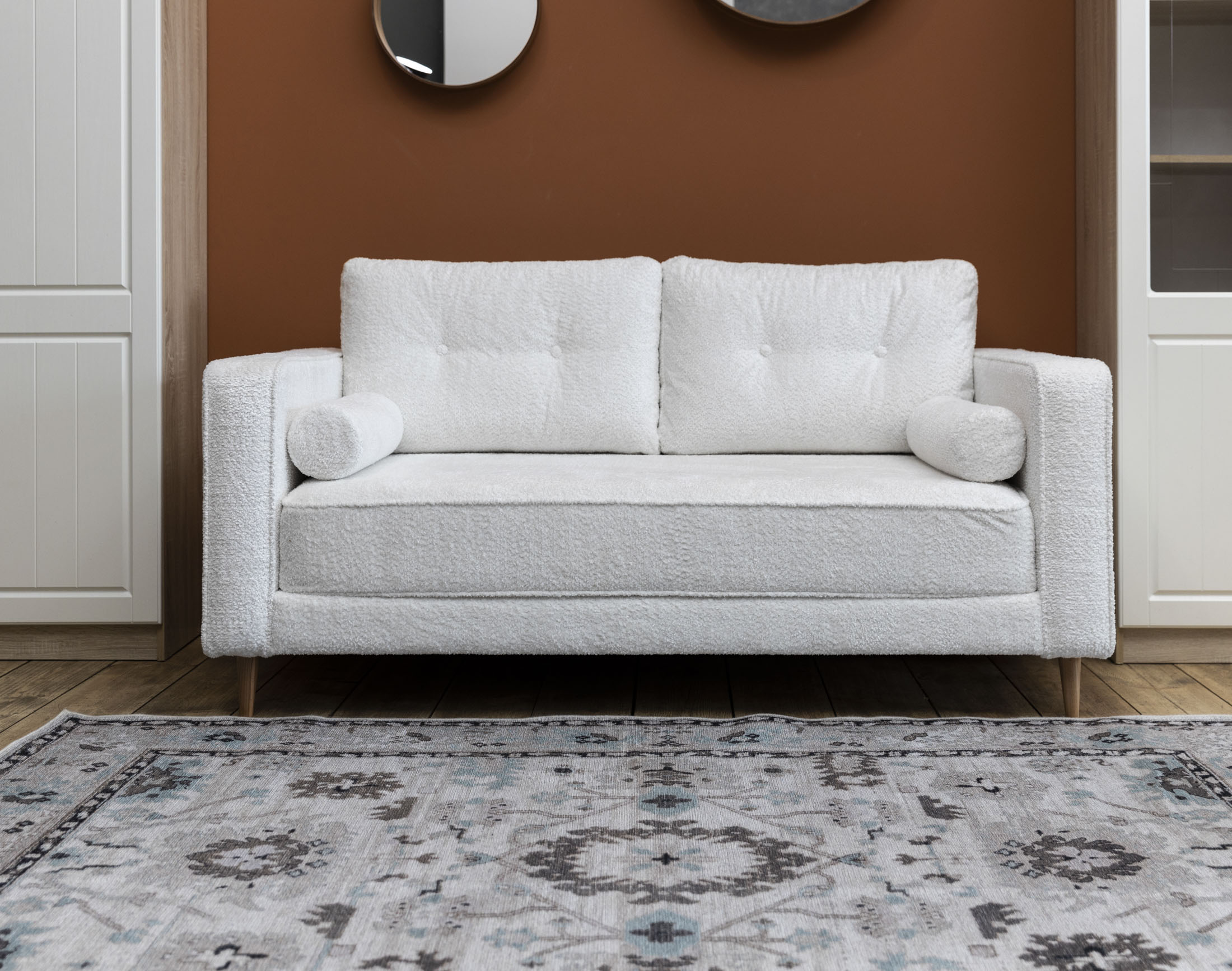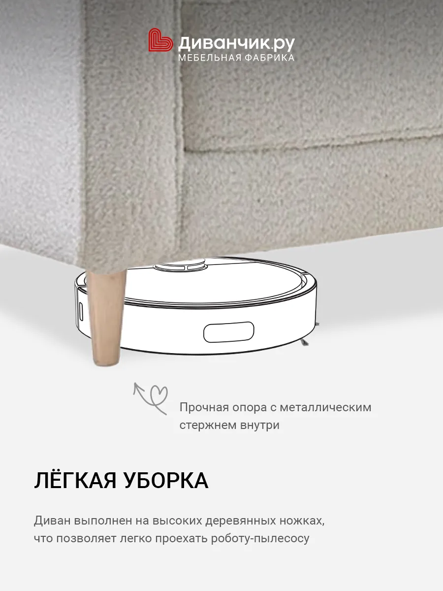 Высокие ножки дивана делают его форму легкой, максимально открывая пространство. А натуральное дерево подчеркивает естественность материалов. Кроме того, такая конструкция упрощает уборку, делая доступным напольное покрытие.