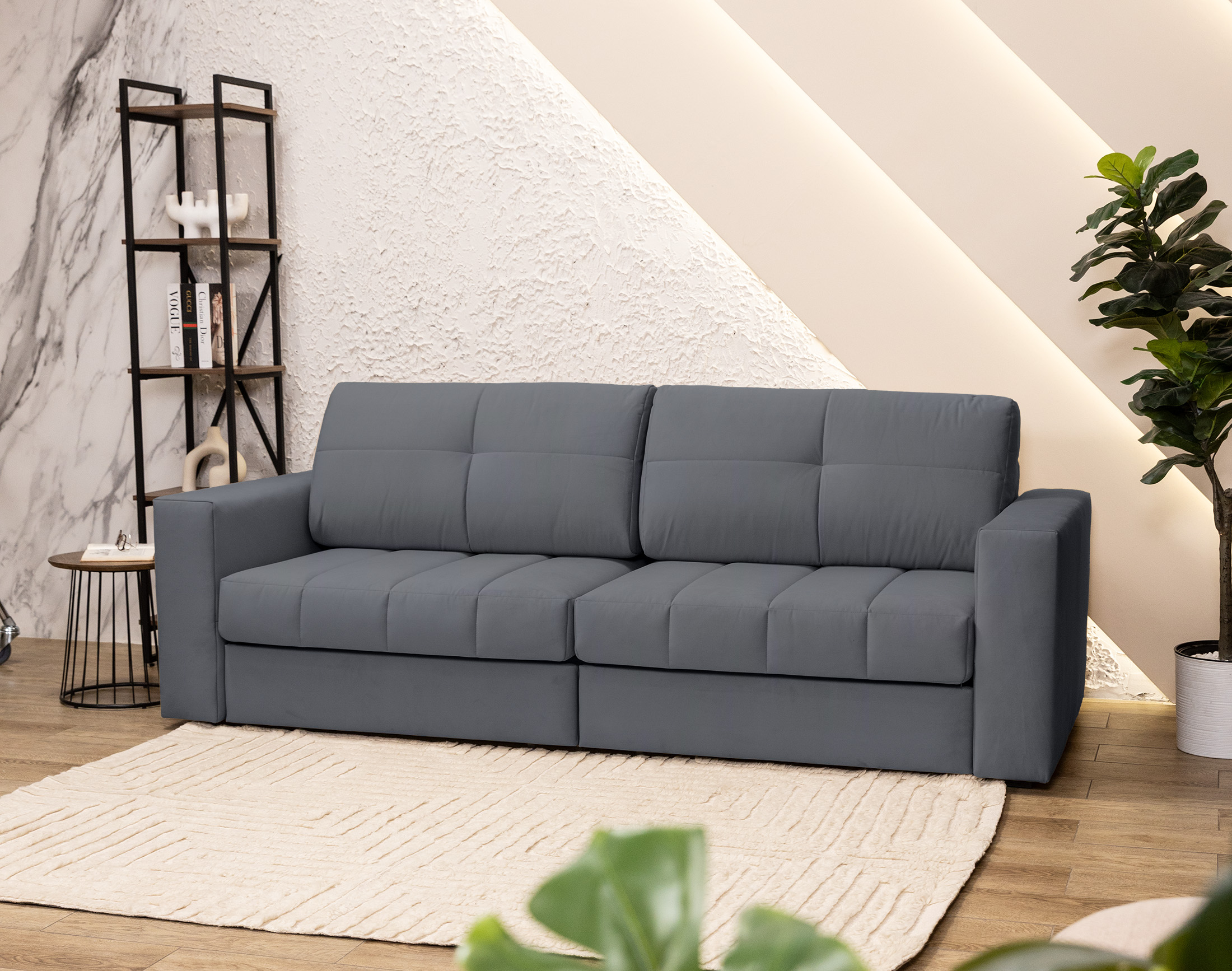 Чёткие геометрические линии придают дивану аккуратный, современный вид и подчёркивают порядок в интерьере: такая форма выглядит стильно, гармонично сочетается с другой мебелью и визуально «собирает» пространство.