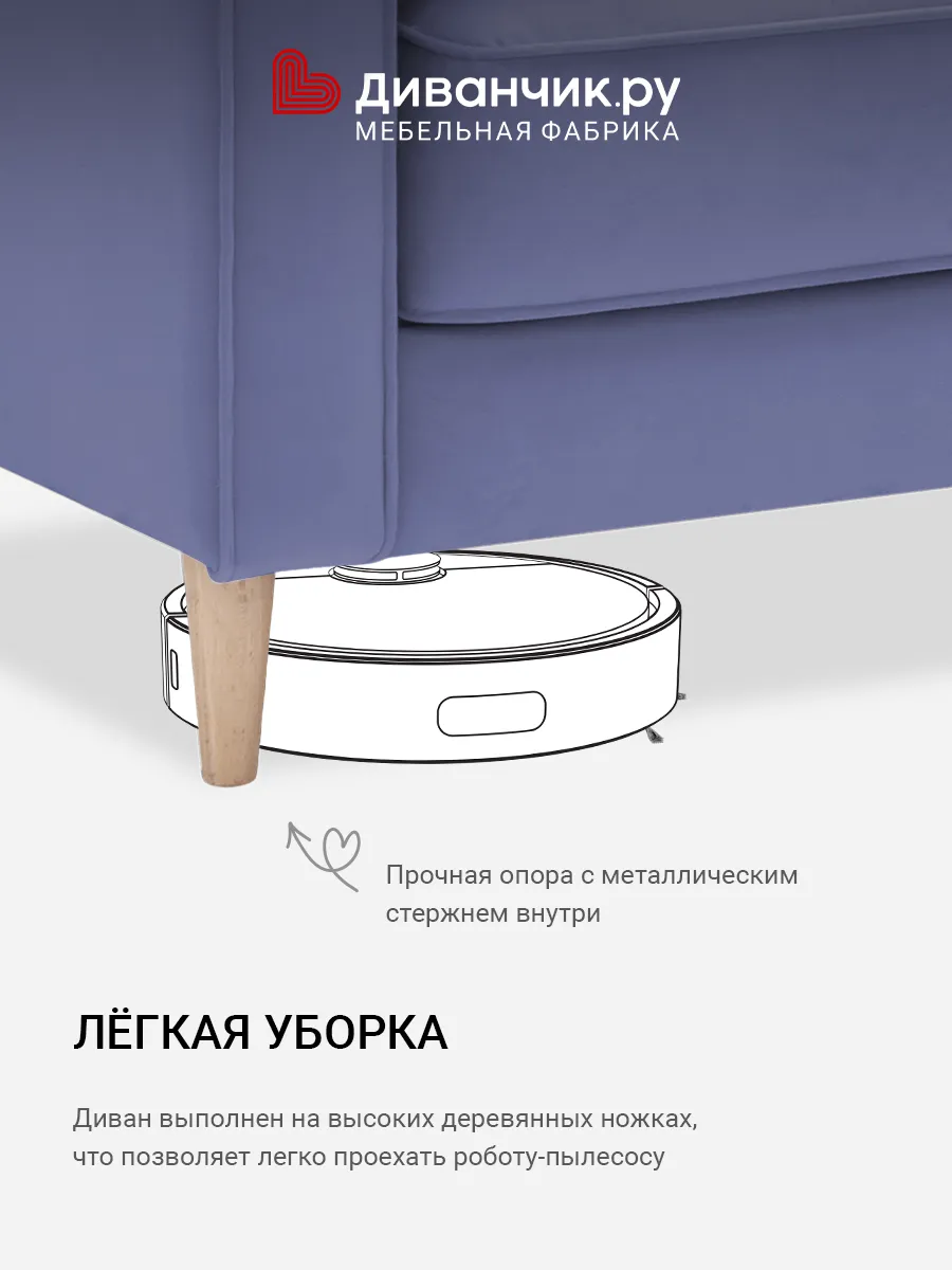 Высокие ножки дивана делают его форму легкой, максимально открывая пространство. А натуральное дерево подчеркивает естественность материалов. Кроме того, такая конструкция упрощает уборку, делая доступным напольное покрытие.