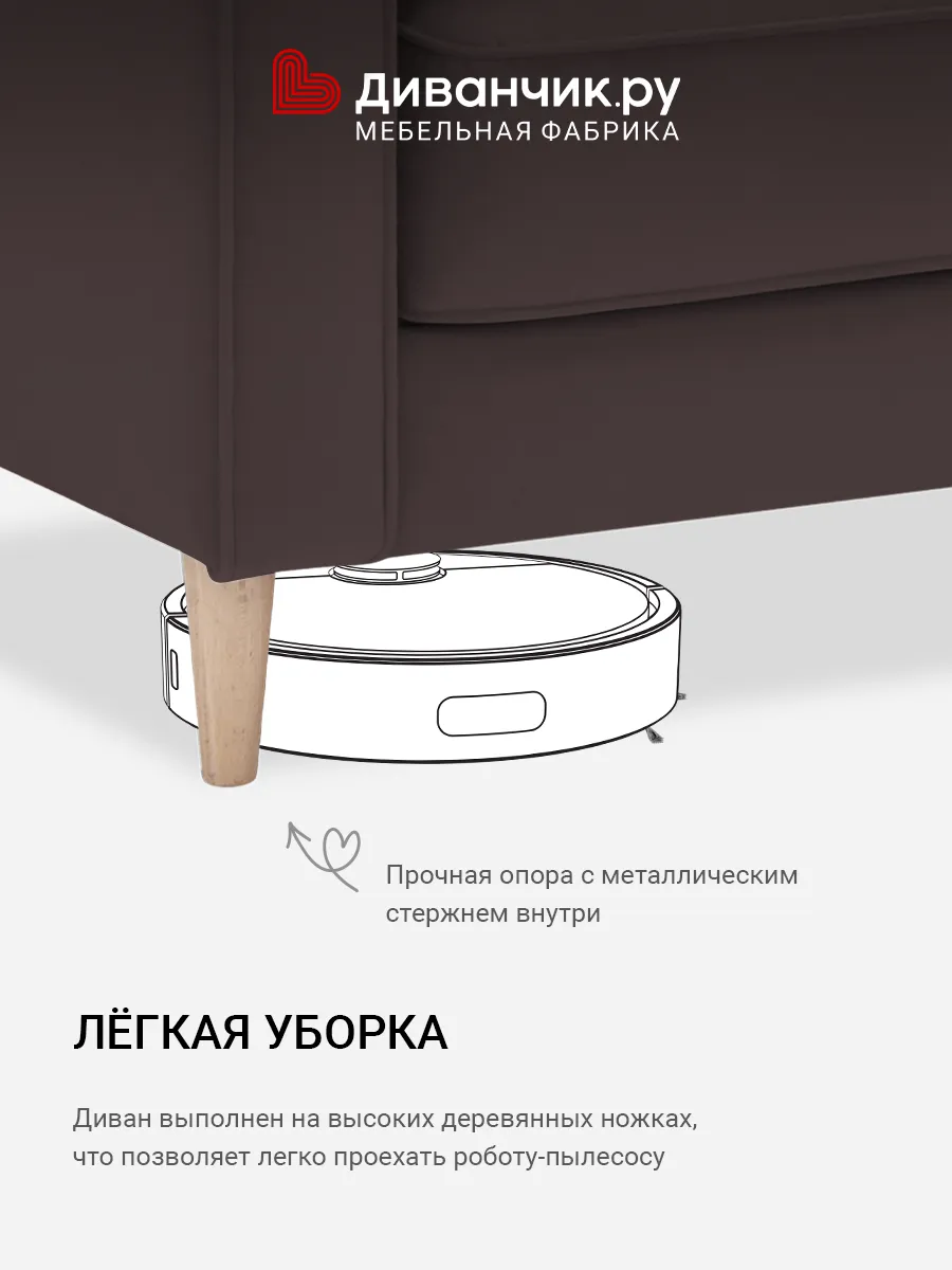 Высокие ножки дивана делают его форму легкой, максимально открывая пространство. А натуральное дерево подчеркивает естественность материалов. Кроме того, такая конструкция упрощает уборку, делая доступным напольное покрытие.