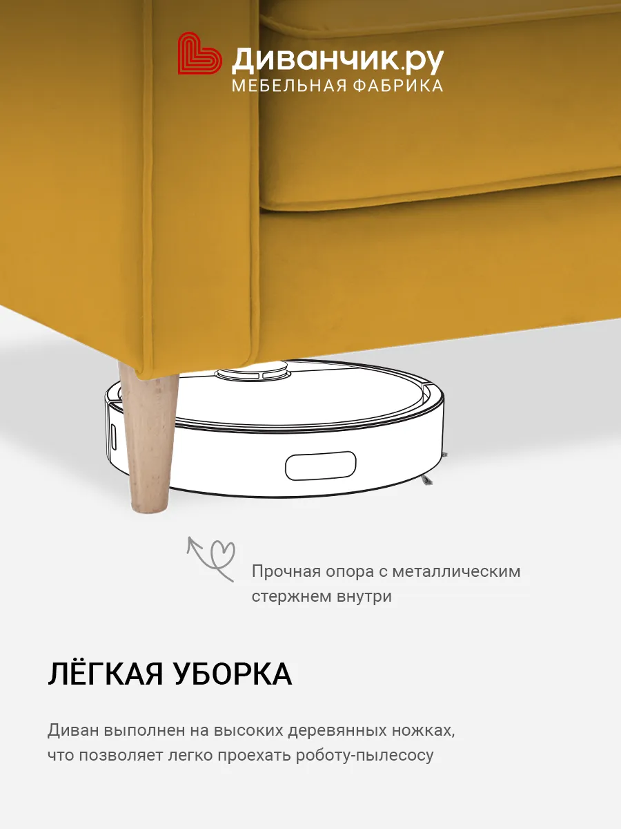 Высокие ножки дивана делают его форму легкой, максимально открывая пространство. А натуральное дерево подчеркивает естественность материалов. Кроме того, такая конструкция упрощает уборку, делая доступным напольное покрытие.