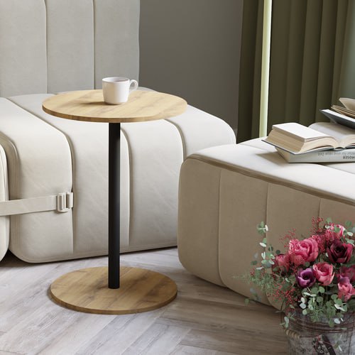 Журнальный столик со стальной опорой «КАТ» – изящное решение для современной гостиной. Центральная опора оканчивается круглым основанием. Столешница и основание изготовлены из МДФ 12 мм в цвете дуб вотан, что делает их легкими и необыкновенно элегантными. Конструкция с четкими линиями выглядит привлекательно и сбалансированно.