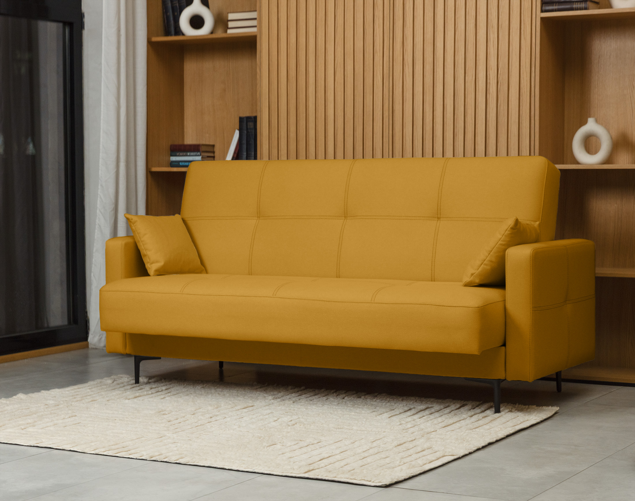 Высокие ножки дивана делают его форму легкой, максимально открывая пространство. Кроме того, такая конструкция упрощает уборку, делая доступным напольное покрытие.