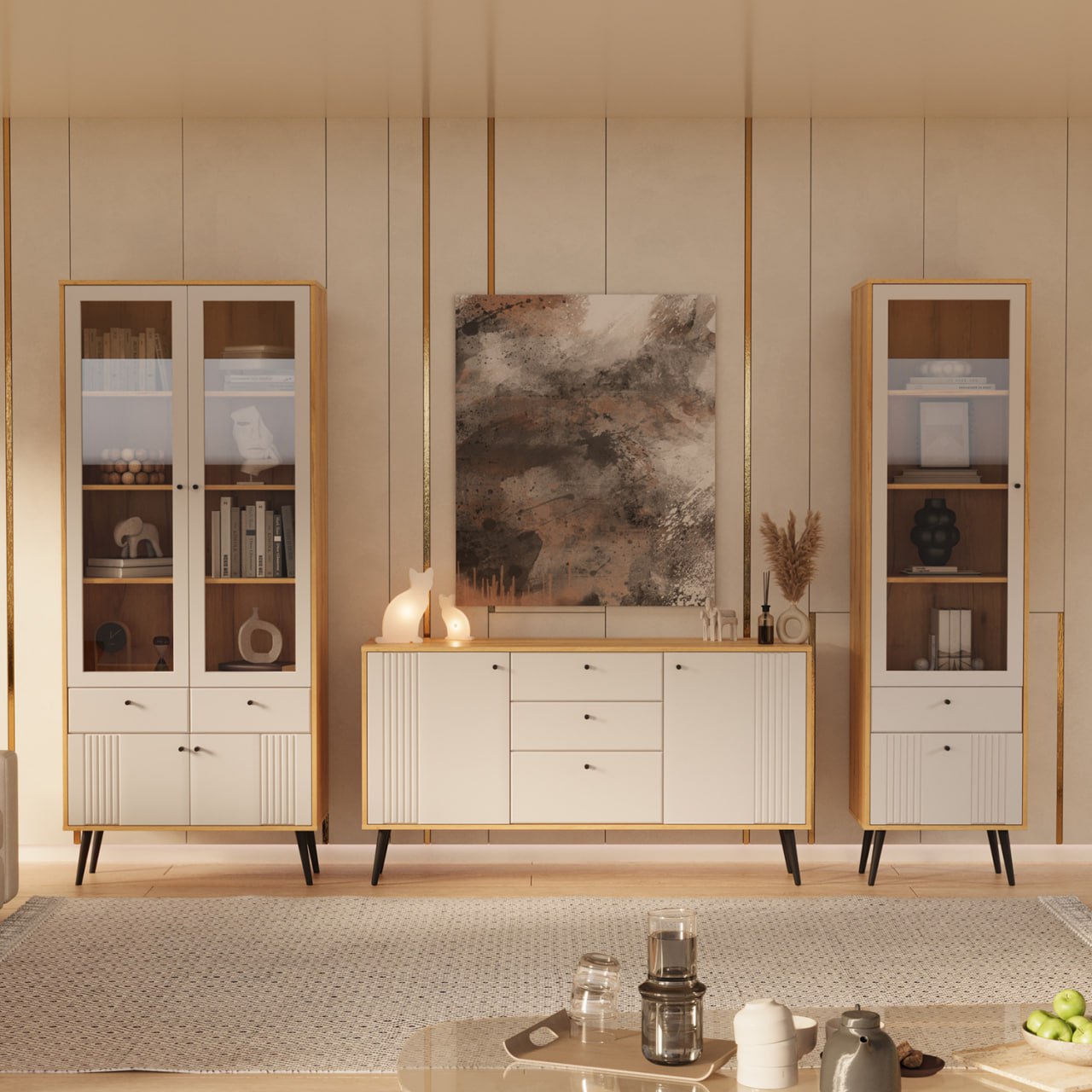 Комодино «Саксония» — это стильный модуль для спальни или гостиной. Оригинальный дизайн, в котором отсутствуют стандартные и скучные решения, придаст интерьеру уютный вид. Вы можете установить на него телевизор или украсить статуэтками, вазами или рамочками с любимыми фото. Удобство хранения в закрытом виде обеспечивают 3 выдвижных ящика, а также большие отделы с распашными дверцами.