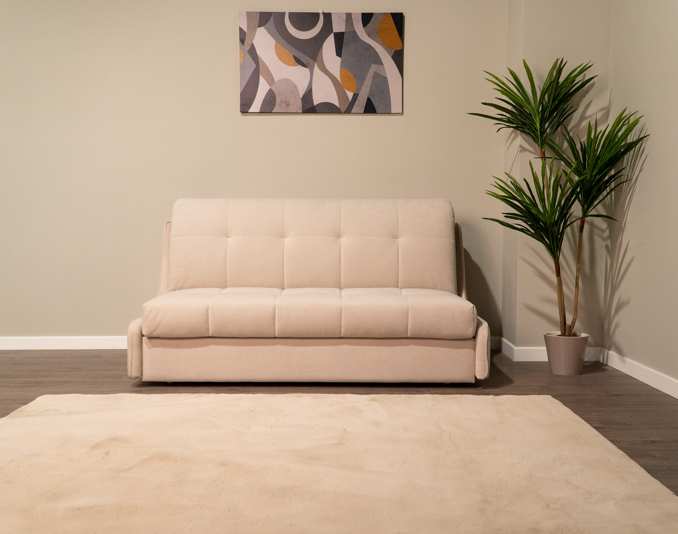Идеальный пример эргономичной мебели. Небольшой по габаритам диван легко трансформируется в полноценное спальное место для двоих.