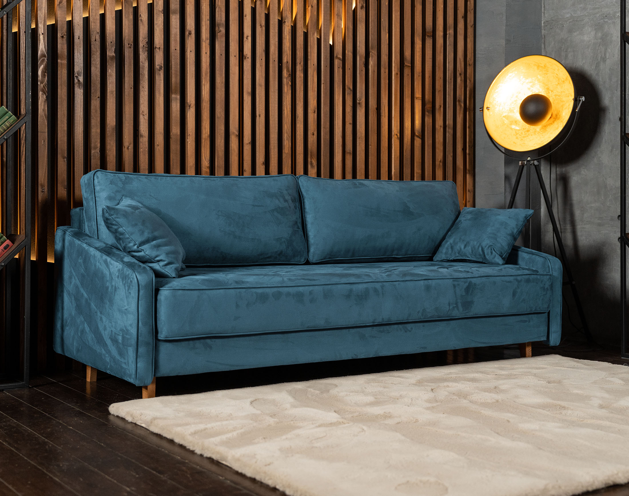 Высокие ножки дивана делают его форму легкой, максимально открывая пространство. А натуральное дерево подчеркивает естественность материалов. Кроме того, такая конструкция упрощает уборку, делая доступным напольное покрытие.