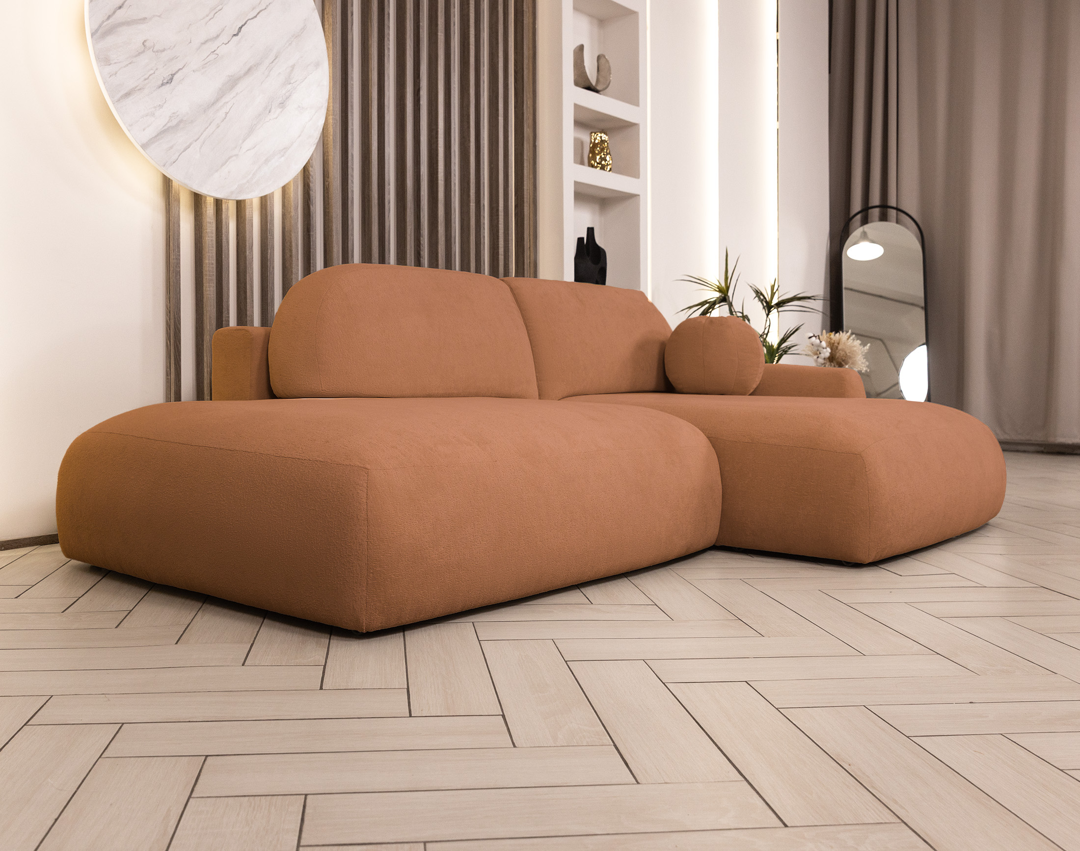 Фактурная поверхность ткани создаёт глубину и структуру, делая мебель изысканной и визуально выразительной.
