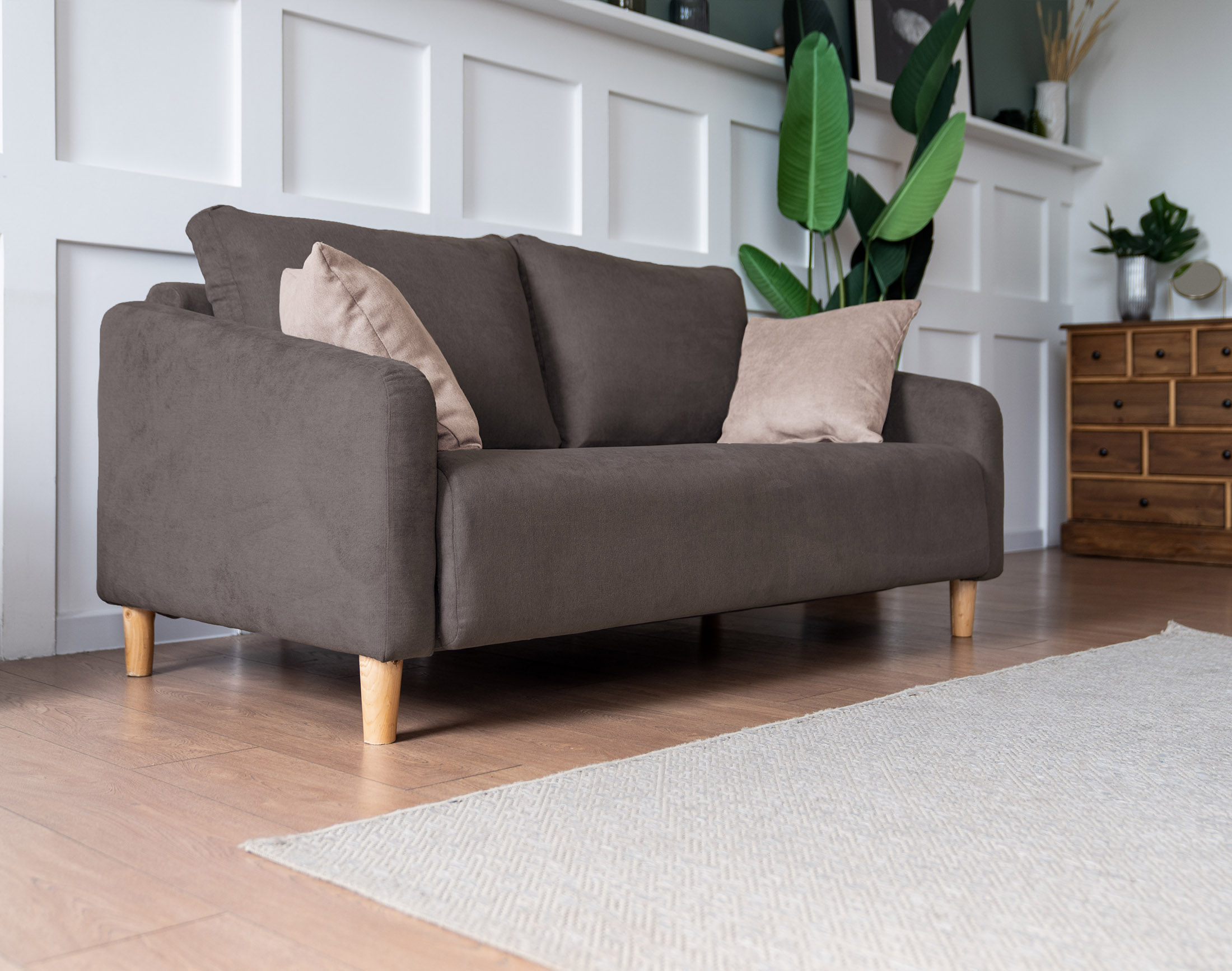 Высокие ножки дивана делают его форму легкой, максимально открывая пространство. А натуральное дерево подчеркивает естественность материалов. Кроме того, такая конструкция упрощает уборку, делая доступным напольное покрытие.