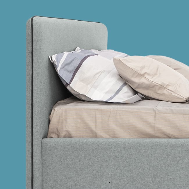 Cкругленный торец изголовья кровати оформленный контрастным декоративным кантом, подчеркивает лаконичный скандинавский стиль.