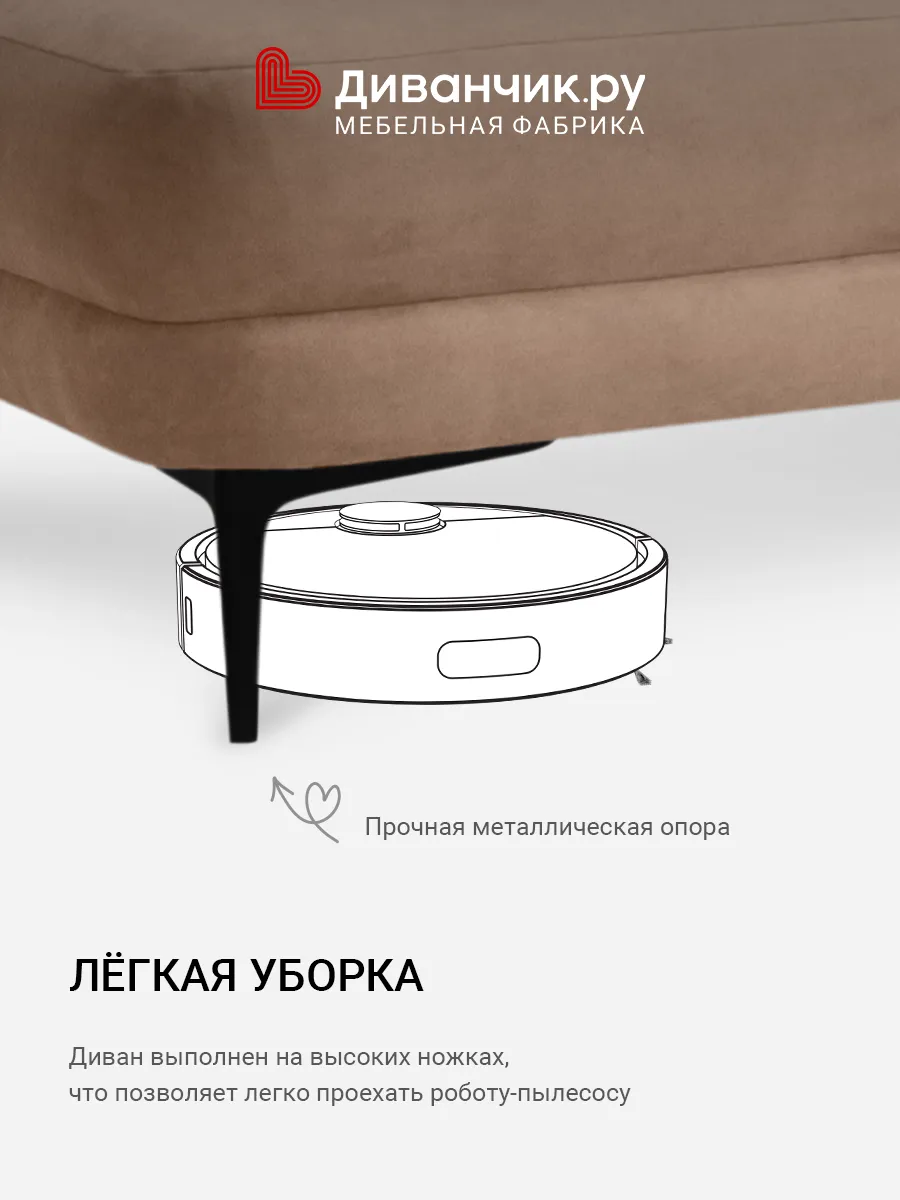 Новый тренд в мягкой мебели. Благодаря высоким ножкам диван выглядит лаконично и элегантно, придавая интерьеру лёгкость и уют. Кроме того, такая конструкция упрощает уборку под диваном.