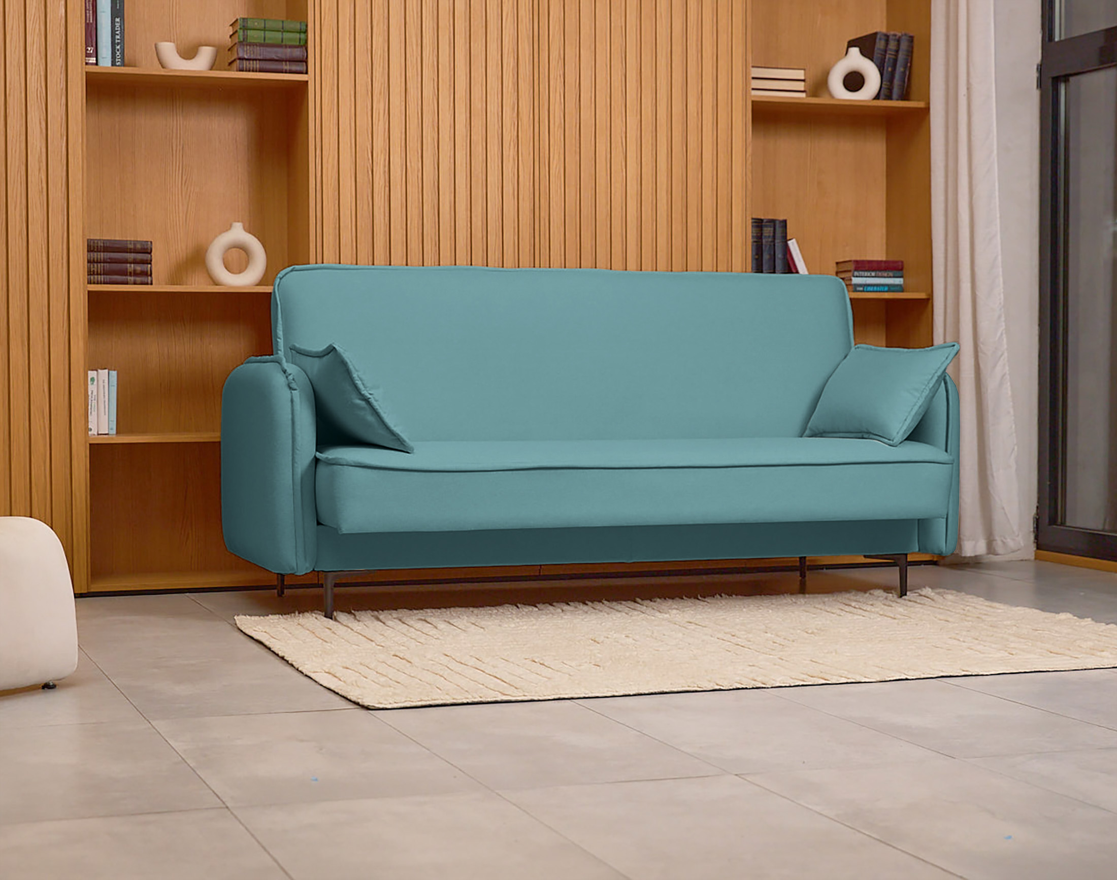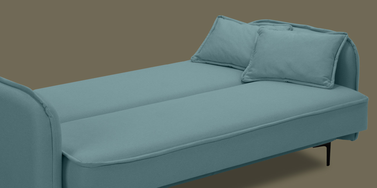 Высокие ножки дивана делают его форму легкой, максимально открывая пространство. Кроме того, такая конструкция упрощает уборку, делая доступным напольное покрытие.