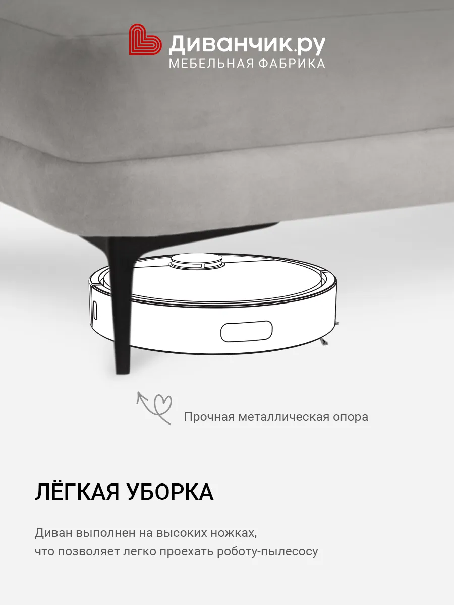 Новый тренд в мягкой мебели. Благодаря высоким ножкам диван выглядит лаконично и элегантно, придавая интерьеру лёгкость и уют. Кроме того, такая конструкция упрощает уборку под диваном.