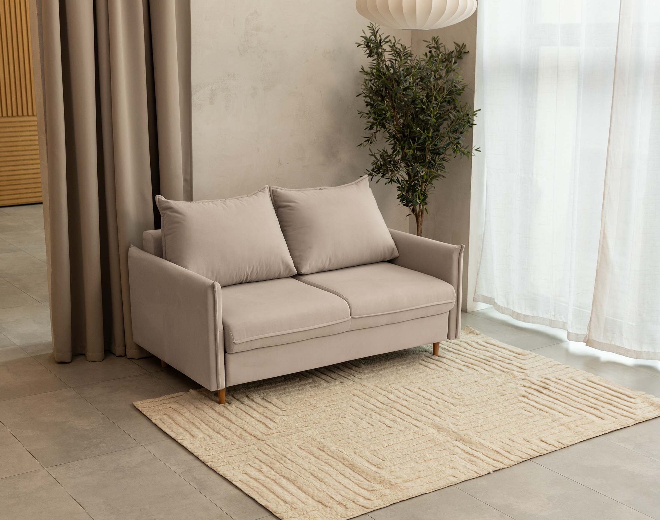 Высокие ножки дивана делают его форму легкой, максимально открывая пространство. А натуральное дерево подчеркивает естественность материалов. Кроме того, такая конструкция упрощает уборку, делая доступным напольное покрытие.