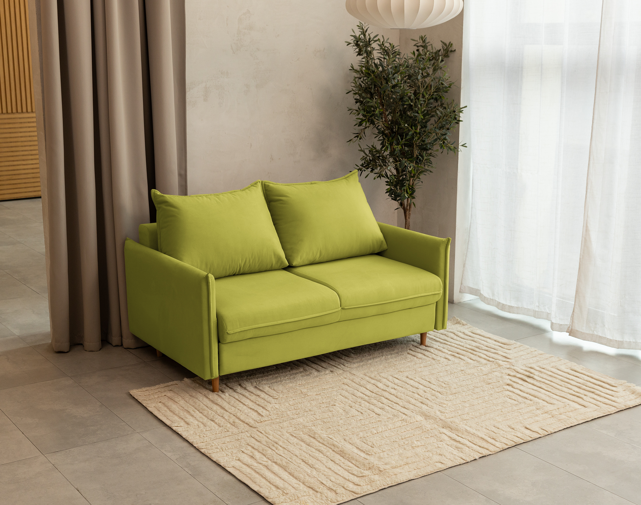 Высокие ножки дивана делают его форму легкой, максимально открывая пространство. А натуральное дерево подчеркивает естественность материалов. Кроме того, такая конструкция упрощает уборку, делая доступным напольное покрытие.