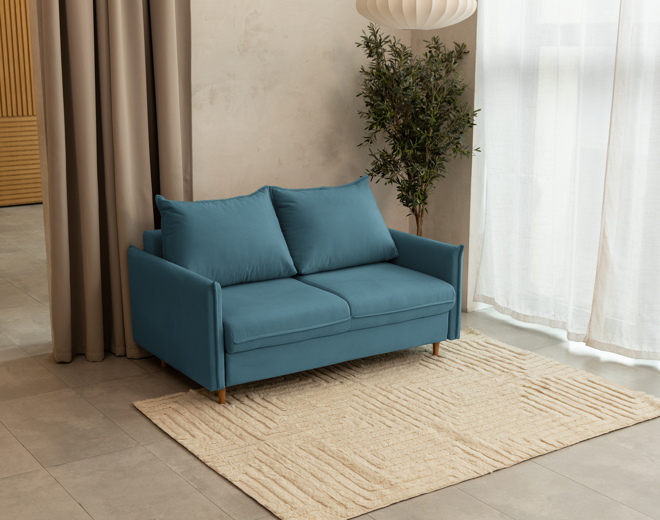 Высокие ножки дивана делают его форму легкой, максимально открывая пространство. А натуральное дерево подчеркивает естественность материалов. Кроме того, такая конструкция упрощает уборку, делая доступным напольное покрытие.