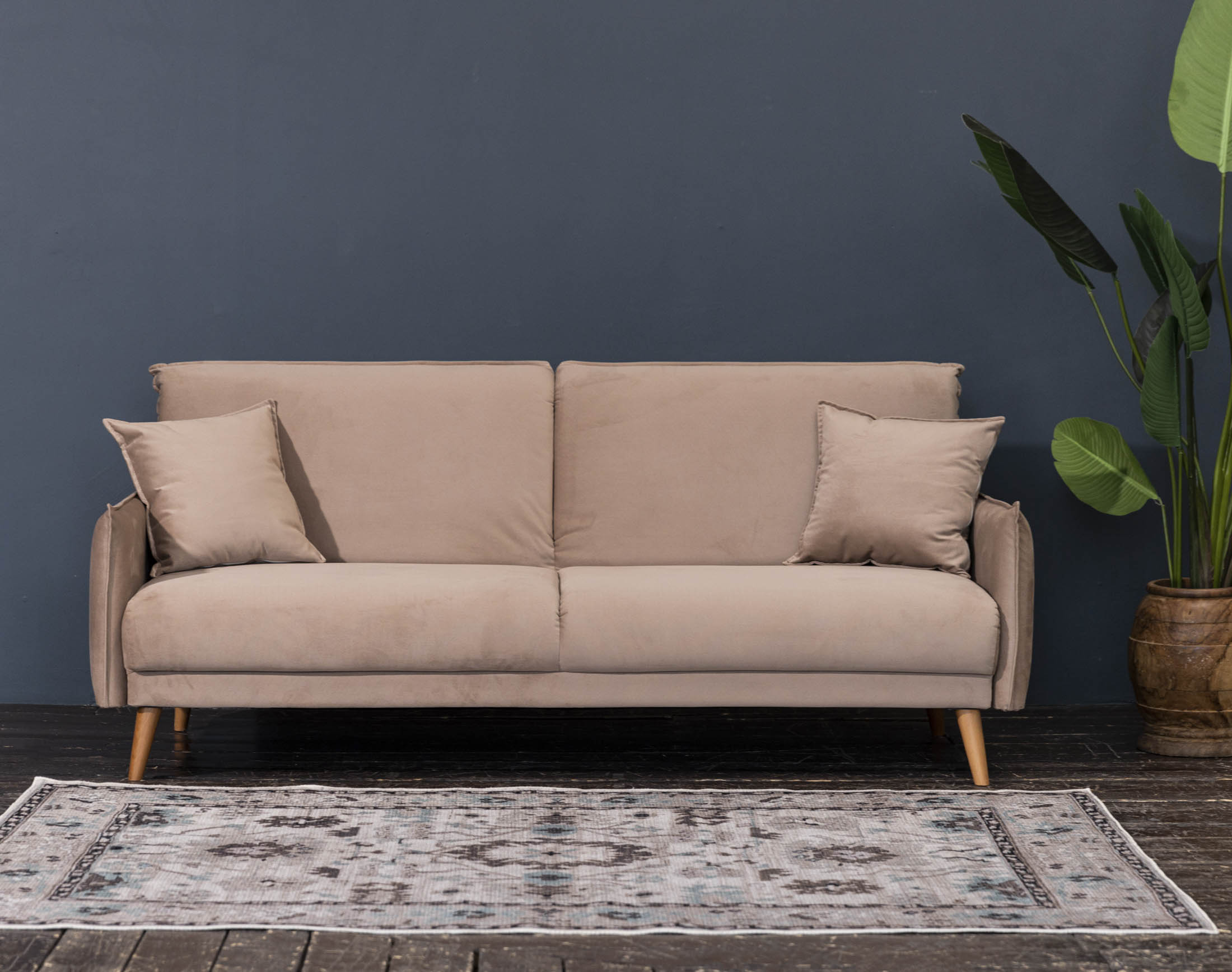 Высокие ножки дивана делают его форму легкой, максимально открывая пространство. А натуральное дерево подчеркивает естественность материалов. Кроме того, такая конструкция упрощает уборку, делая доступным напольное покрытие.
