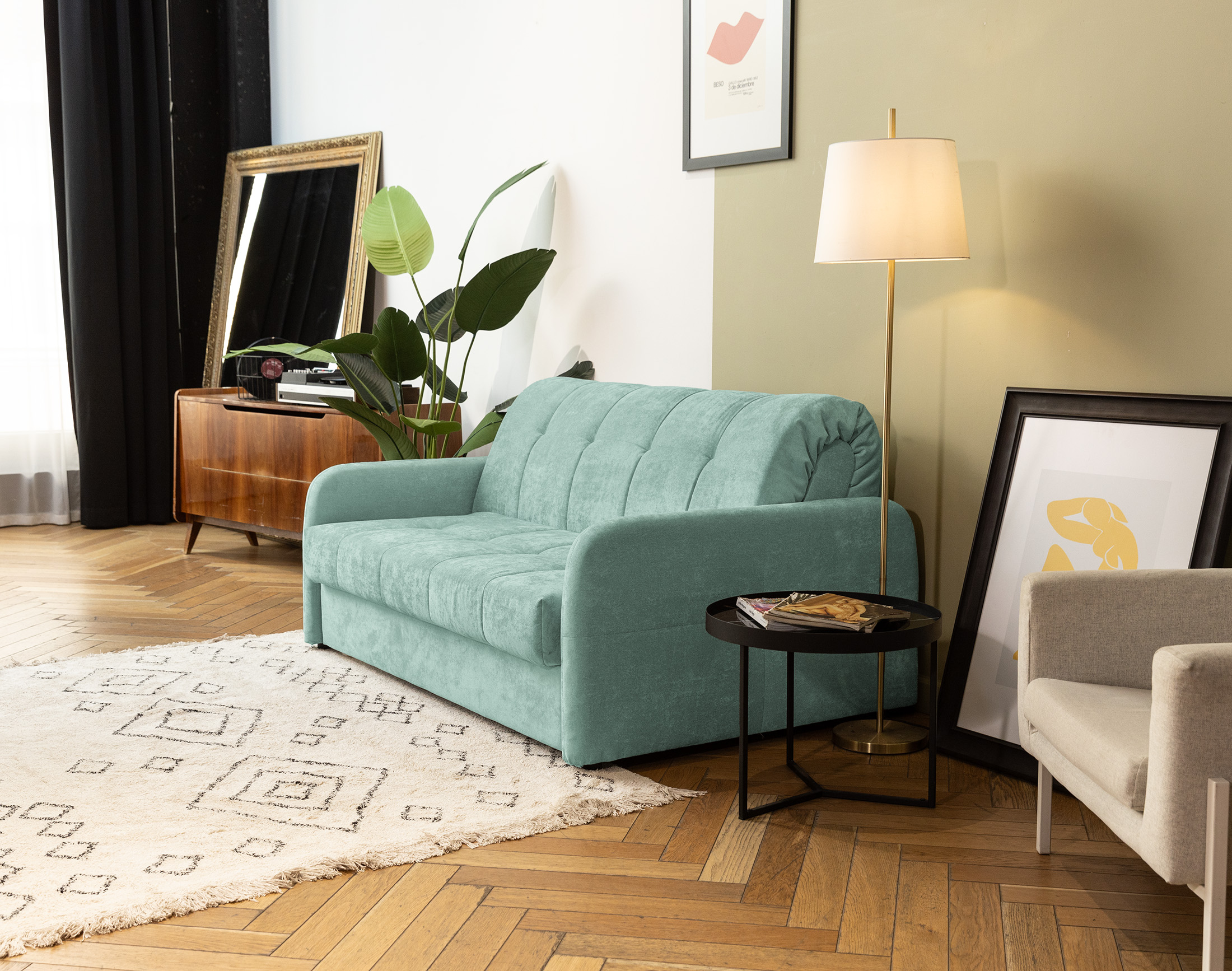 Идеальный пример эргономичной мебели. Небольшой по габаритам диван легко трансформируется в полноценное спальное место для двоих.