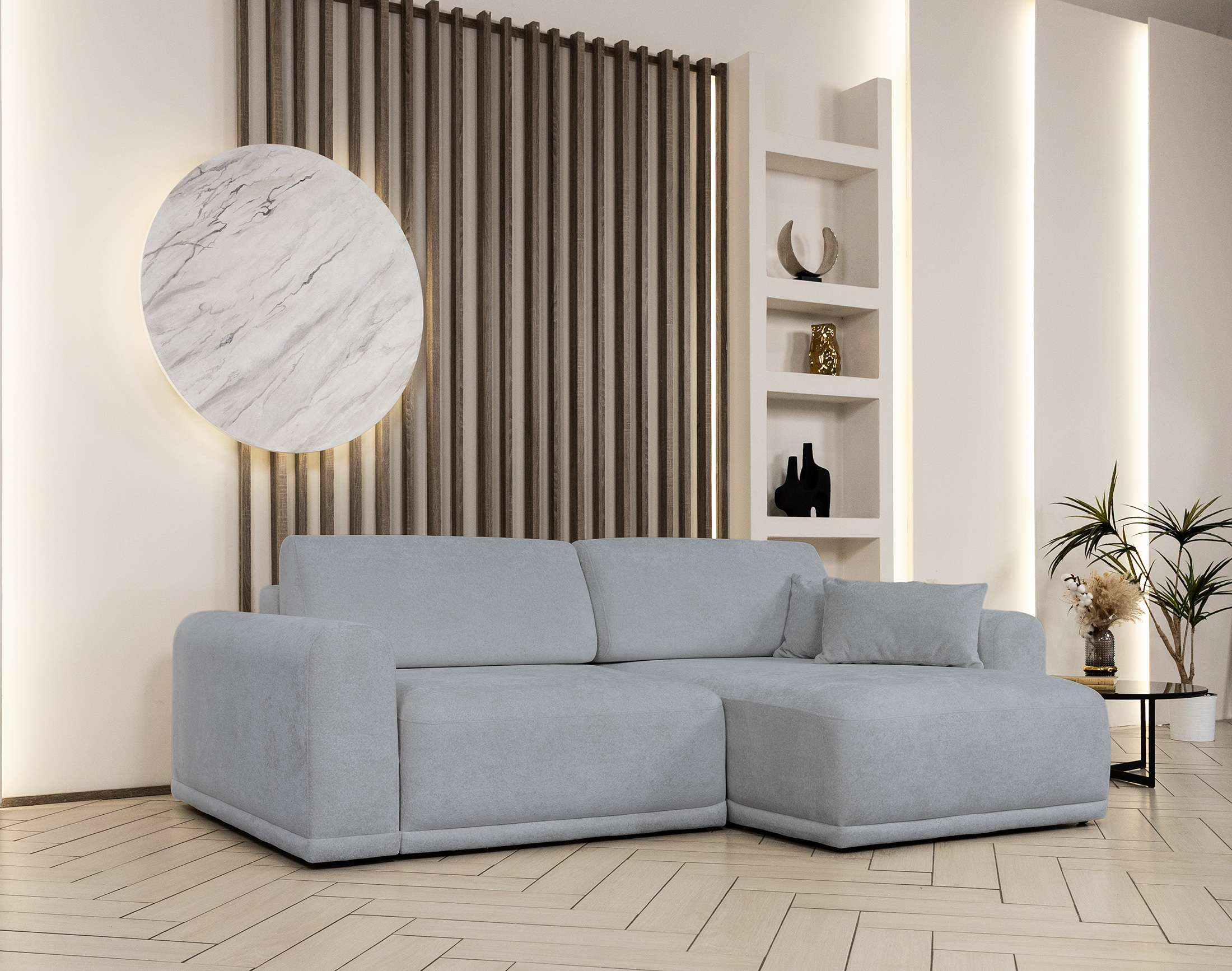 Невероятно мягкий, бархатистый микровелюр обеспечивает высокий уровень тактильного комфорта и придаёт мебели премиальный, уютный характер.