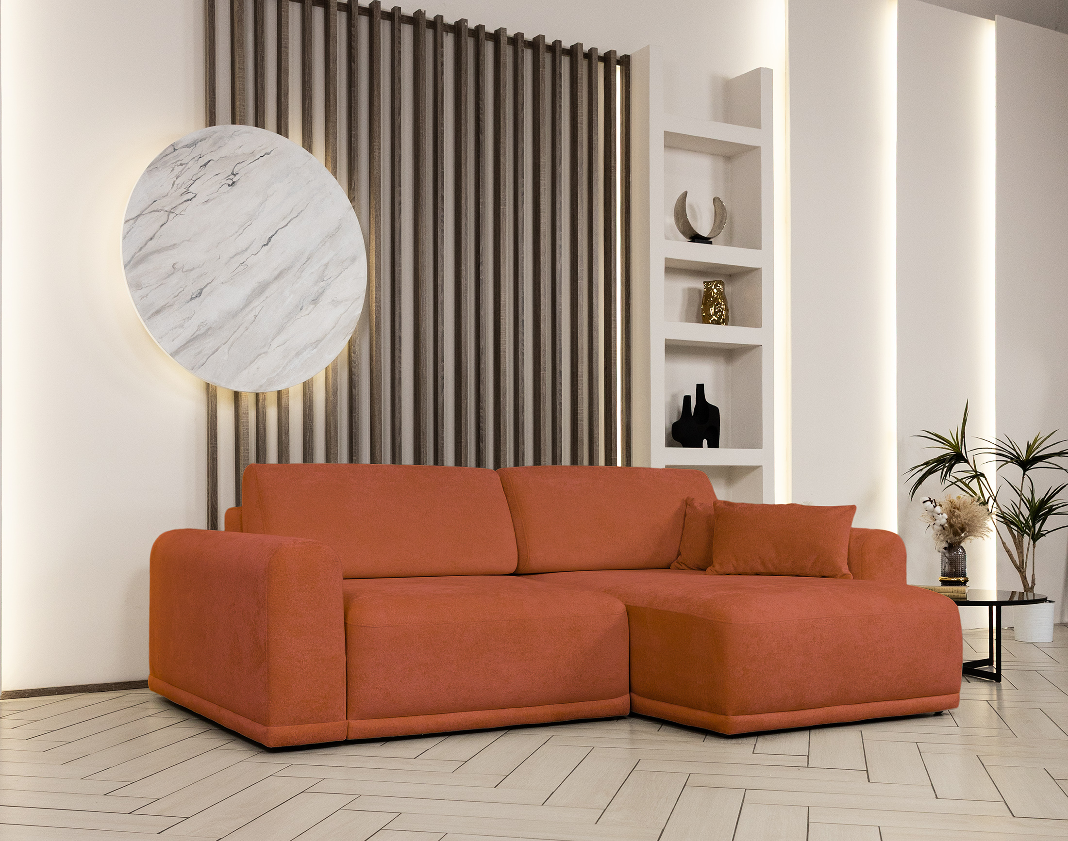 Невероятно мягкий, бархатистый микровелюр обеспечивает высокий уровень тактильного комфорта и придаёт мебели премиальный, уютный характер.