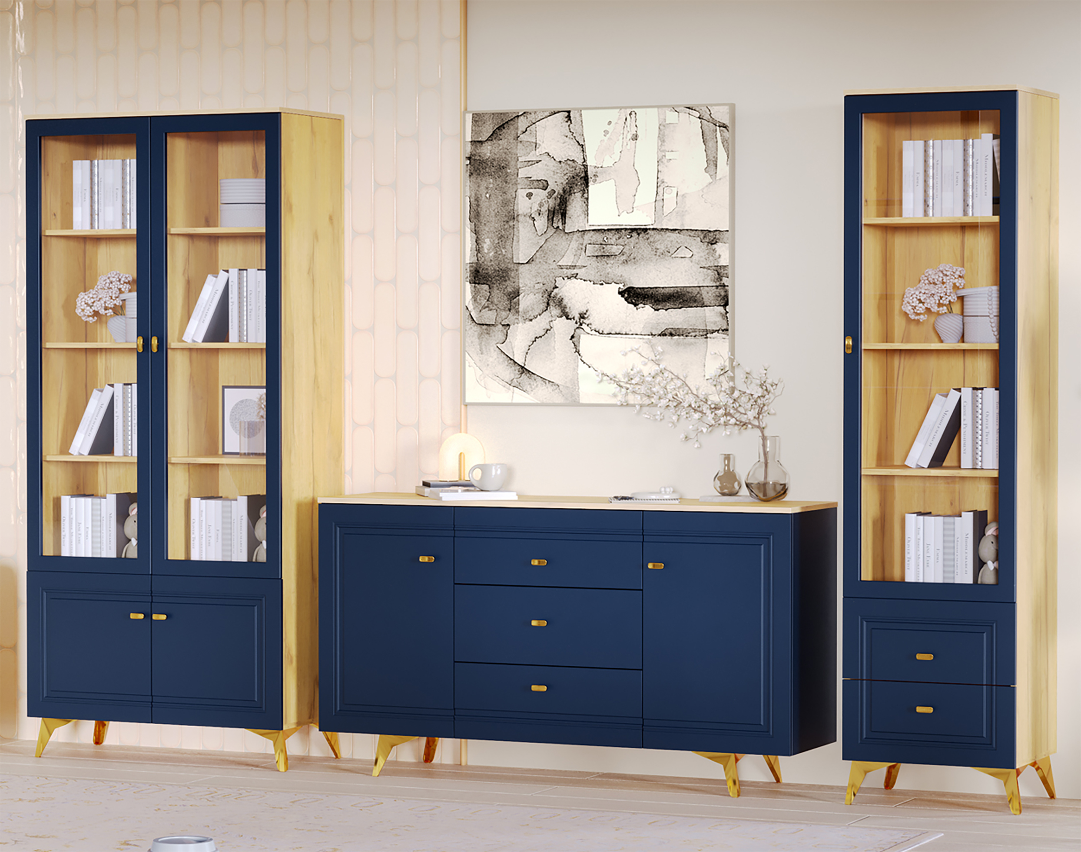 Гостиная Вега Сапфир подойдет для обустройства элегантного интерьера. Набор функциональных элементов позволяет удобно расположить мультимедийную технику, а также найти место для книг, коллекции винила и других памятных вещей. Витрины с прозрачными дверцами и высокие ножки визуально облегчают обстановку.