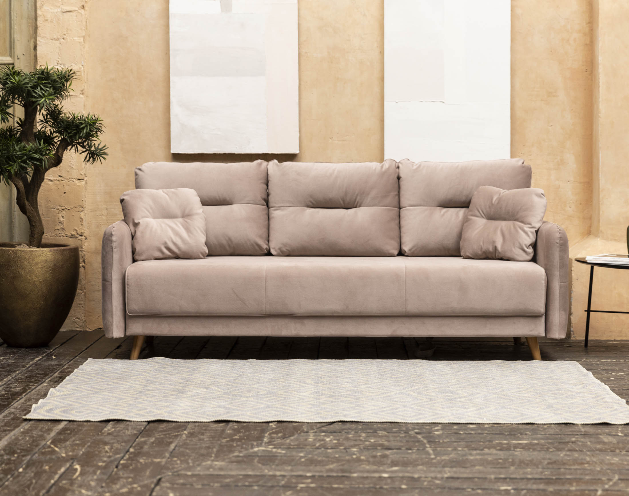 Высокие ножки дивана делают его форму легкой, максимально открывая пространство. А натуральное дерево подчеркивает естественность материалов. Кроме того, такая конструкция упрощает уборку, делая доступным напольное покрытие.