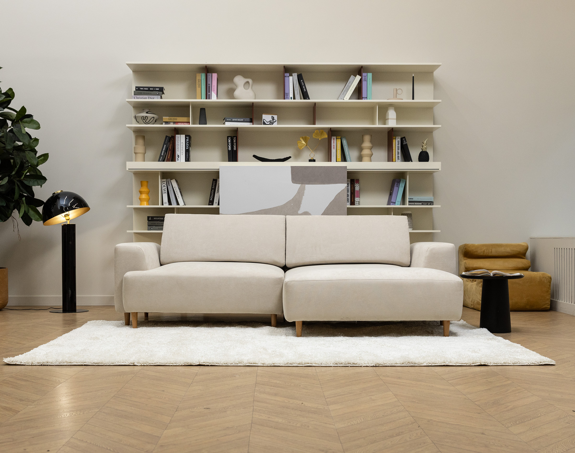 Высокие ножки дивана делают его форму легкой, максимально открывая пространство. А натуральное дерево подчеркивает естественность материалов. Кроме того, такая конструкция упрощает уборку, делая доступным напольное покрытие.