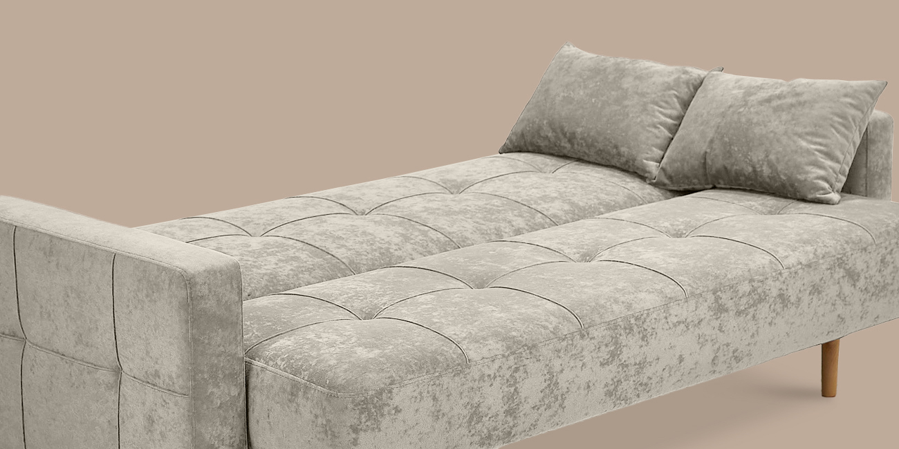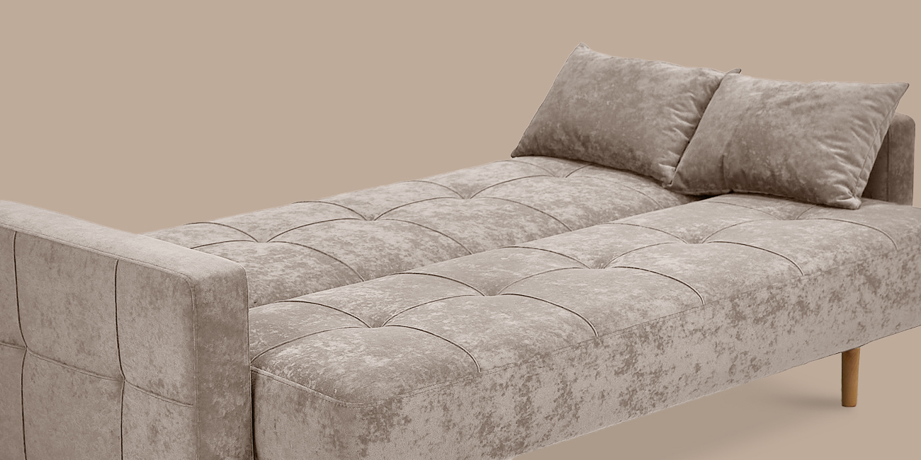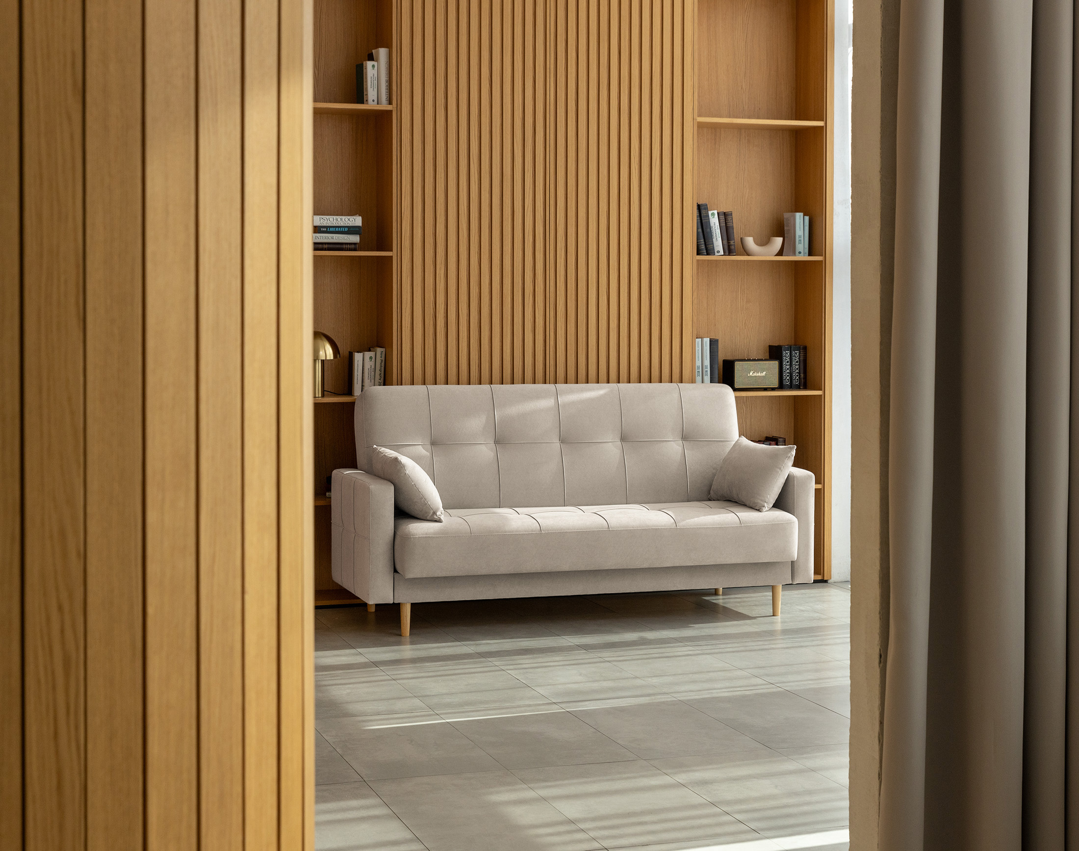 Высокие ножки дивана делают его форму легкой, максимально открывая пространство. А натуральное дерево подчеркивает естественность материалов. Кроме того, такая конструкция упрощает уборку, делая доступным напольное покрытие.