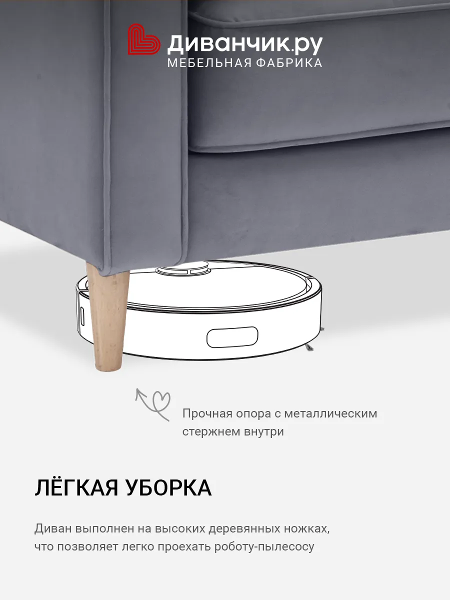Высокие ножки дивана делают его форму легкой, максимально открывая пространство. А натуральное дерево подчеркивает естественность материалов. Кроме того, такая конструкция упрощает уборку, делая доступным напольное покрытие.