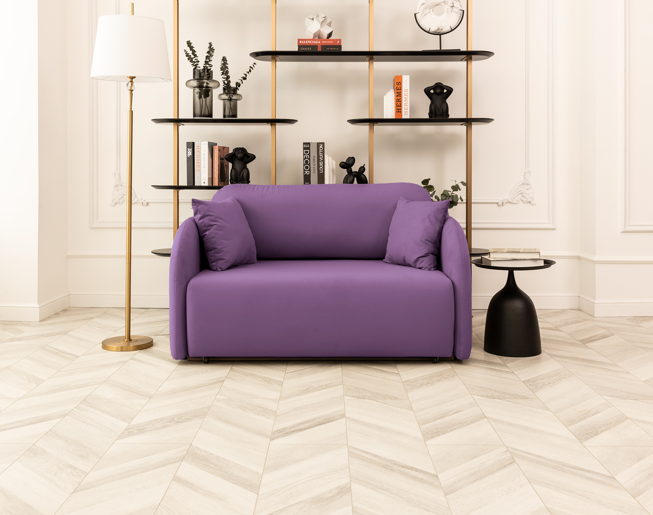 В собранном виде занимает очень маленькую площадь, в разложенном — образует просторное и удобное спальное место. А узкие подлокотники не увеличивают габариты дивана.